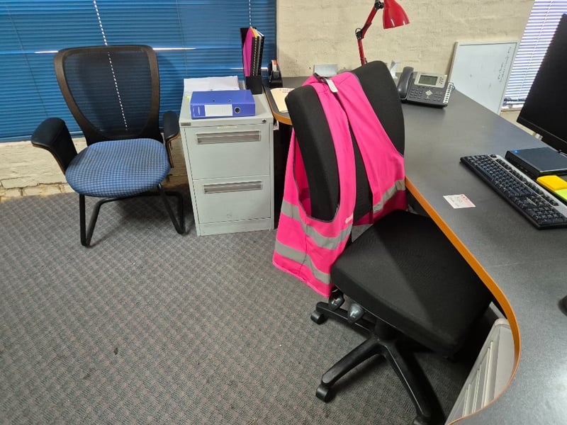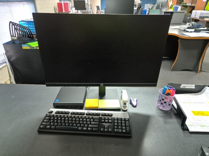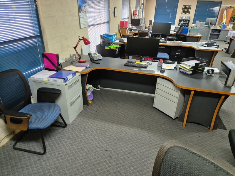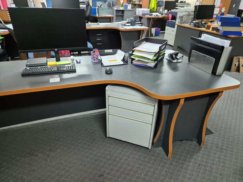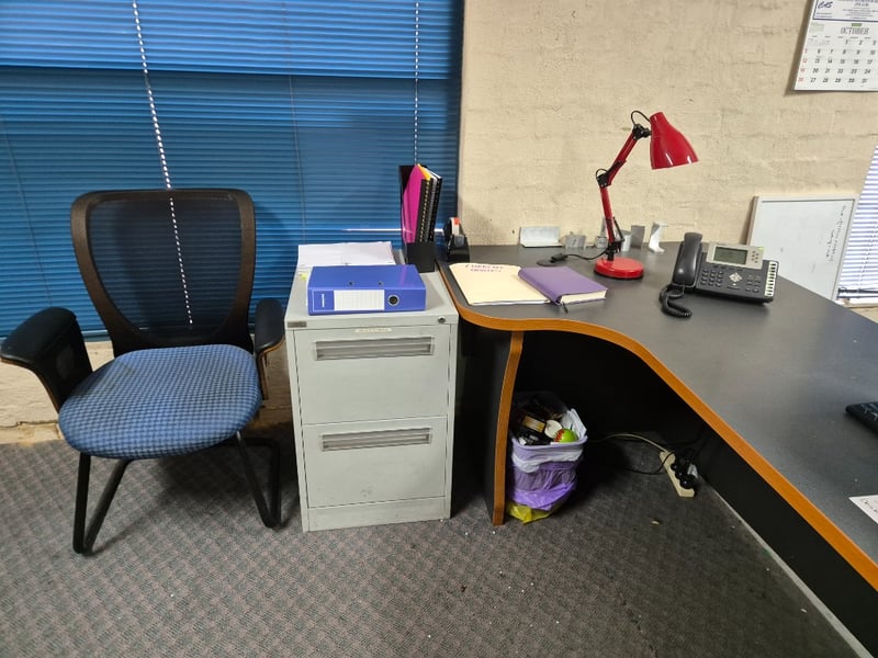 Desk LotLarge Desk2x ChairsI5 HP Pro Mini Nuc Desk Desktop, Monitor, Keyboard & Mouse2x Side Drawer/ Filing CabinetAssorted Stationary & MoreSOLD as Lot MUST TAKE All
