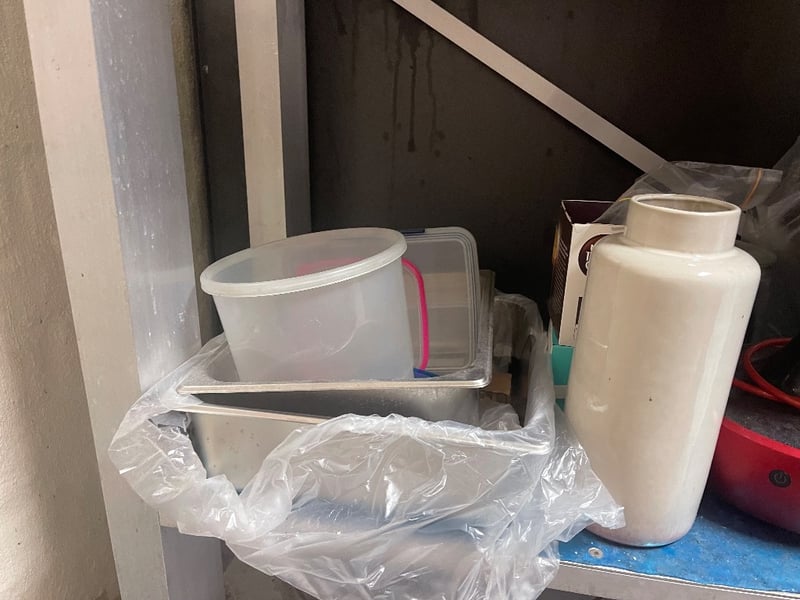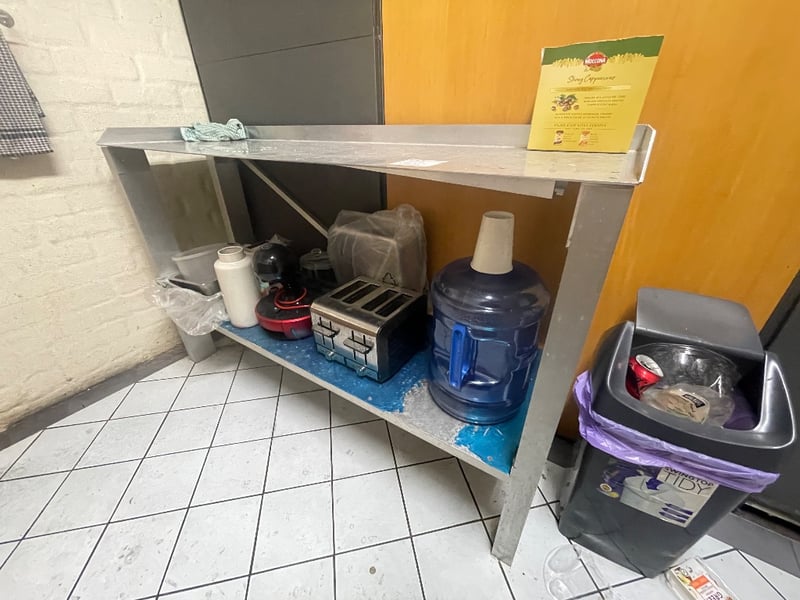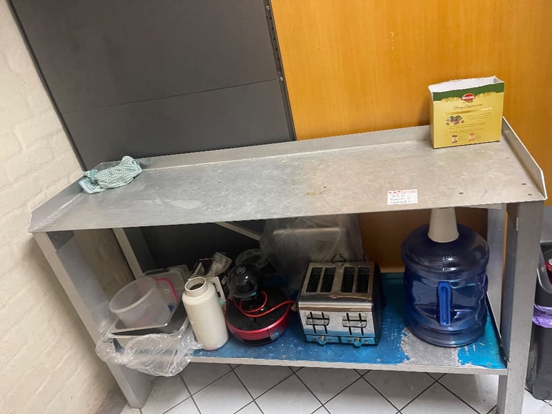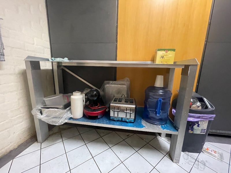 Steel made kitchen bench. (items are included on bench) DIMENSIONS: 150 x 90 x 45 CM