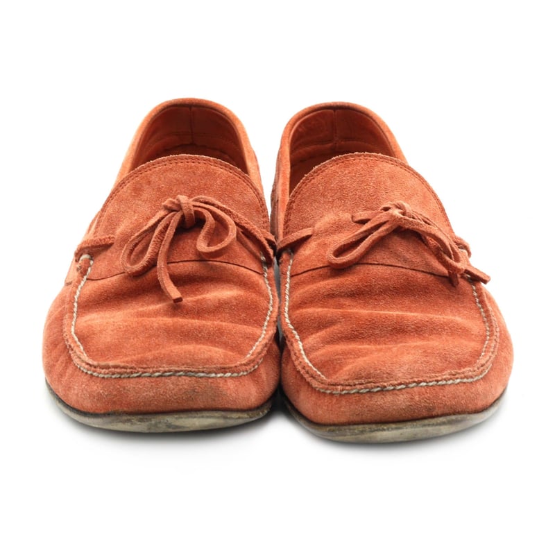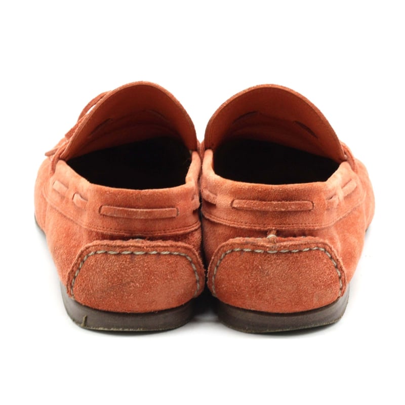 HERMÈS SUEDE BOW SLIP ON LOAFERS SIZE 42 MEN'SSize: DESIGNER 42 HERMES MEN'SMaterialOrange round-toe slip-on suede leather loafers with bow accents at vamps.Additional Condition Report- Significant wear and scratches throughout exterior- Visible wear, scratches and creases at insoles- Significant wear and scuffs at solesComes With- Original Dustbag- Box- Care Card- Certificate of Authenticity CROSSED DOCKED 155365+36