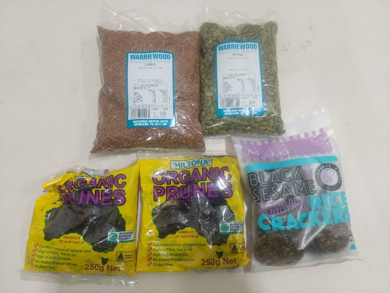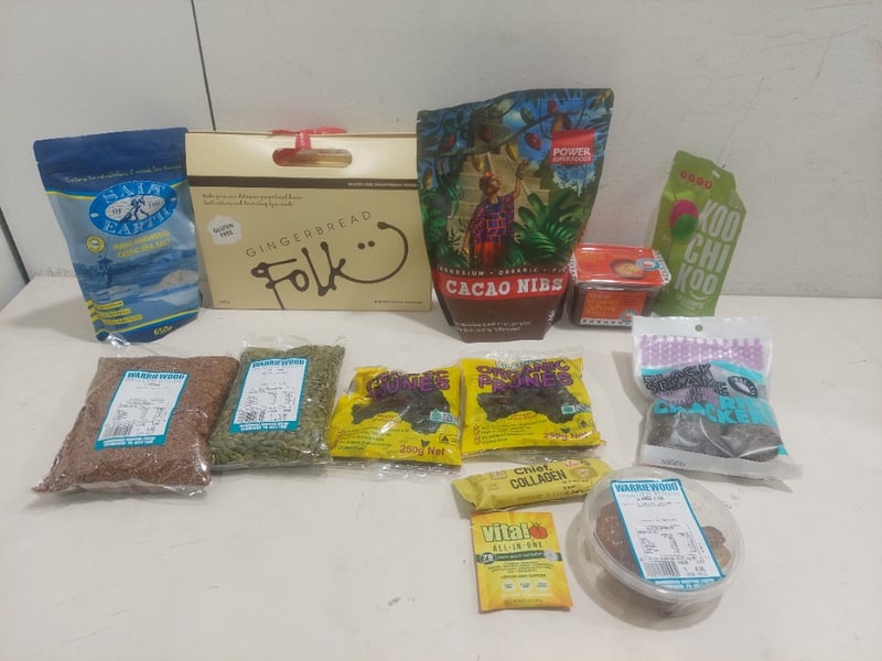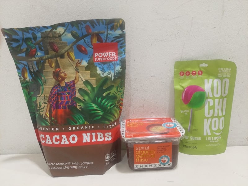 Assorted health and wellness pantry items, including: spiral organoc genmai miso, linseed and more.