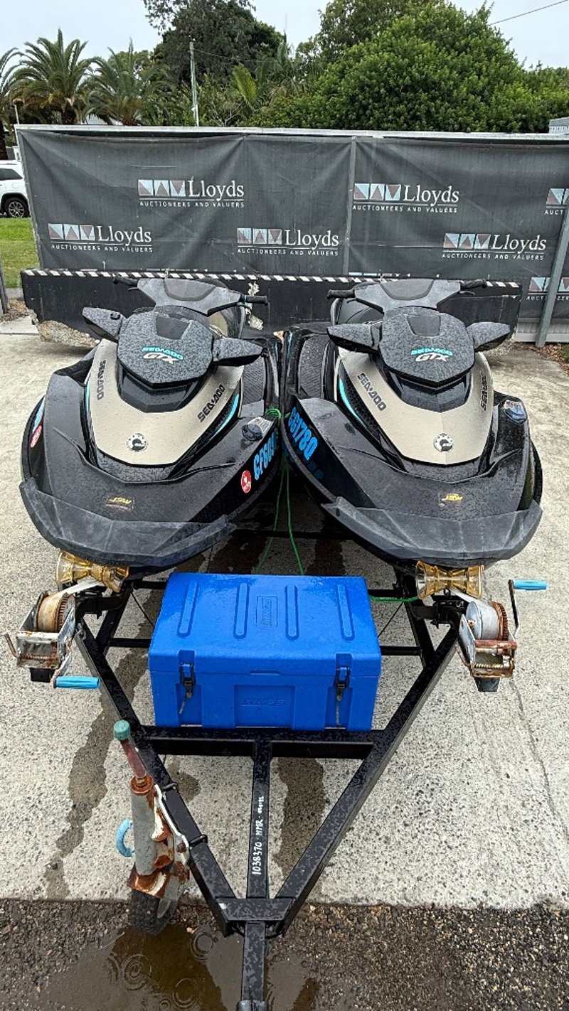 Twin Sea-Doo GTX 155 personal watercraft on a tandem loader trailer. GTX hulls with 3-seat touring configuration. Both units appear complete but no keys supplied. Internal engine bay photo shows surface corrosion and rust staining from standing water – will require inspection NON RUNNING