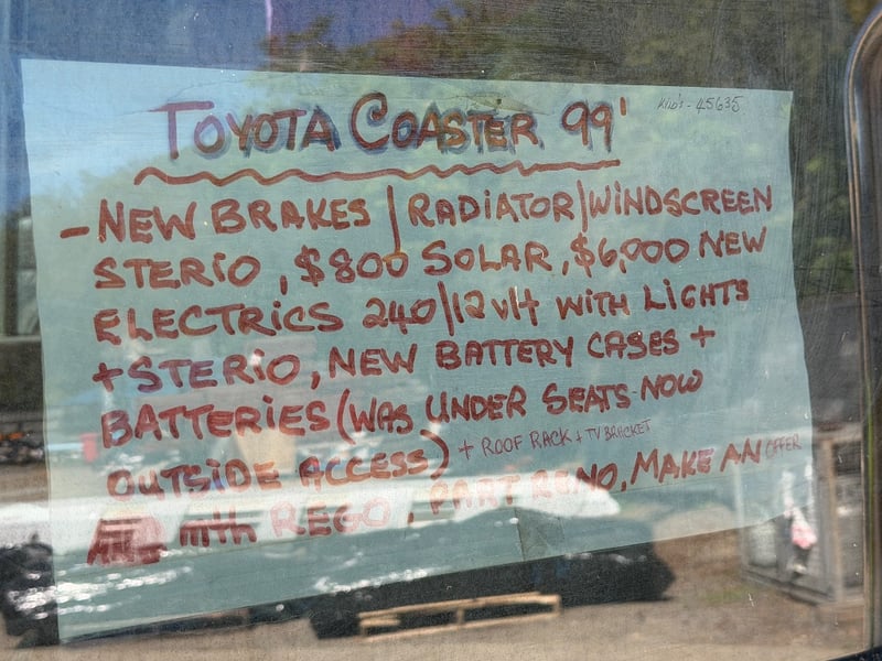 Vendor Reports - Partial Reno, 75% of fit out is completed. Kitchen area seating, bedroom area at back & Shower/toilet area in middle. New Brakes/Radiator/Windscreen/Stereo. $6000 spent on New Electrics 240V/12V with Lights, Battery Cases & Batteries. Roof Racks & TV Mount.