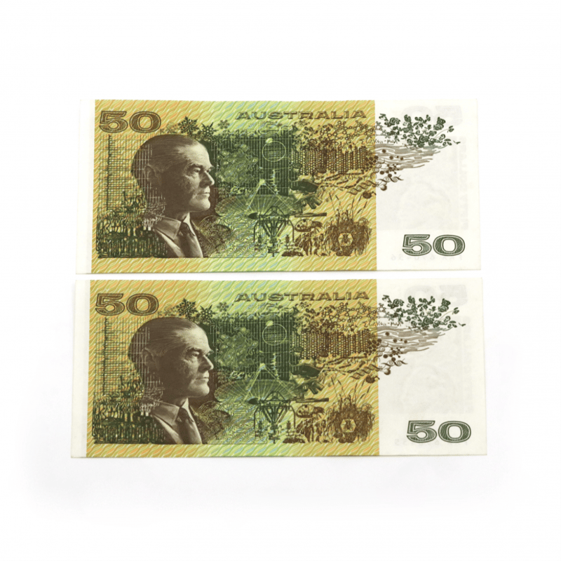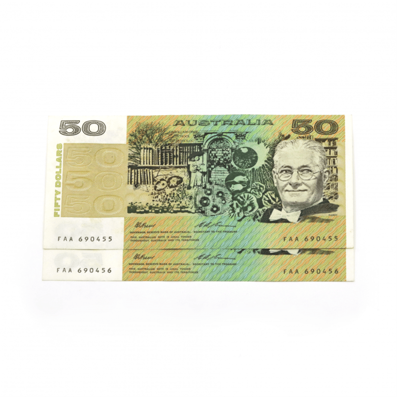 2 X AUSTRALIAN 50 DOLLAR BANK NOTE, FRAZER/EVANS SIGNATURES, UNCIRCULATED, SEQUENTIAL NUMBERS FAA 690455, FAA 690456. Condition: PRE-OWNED645934+9420