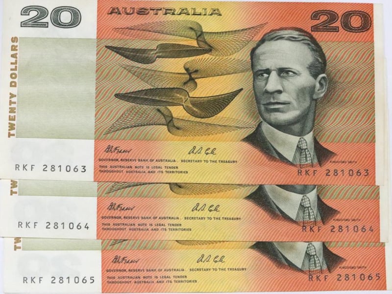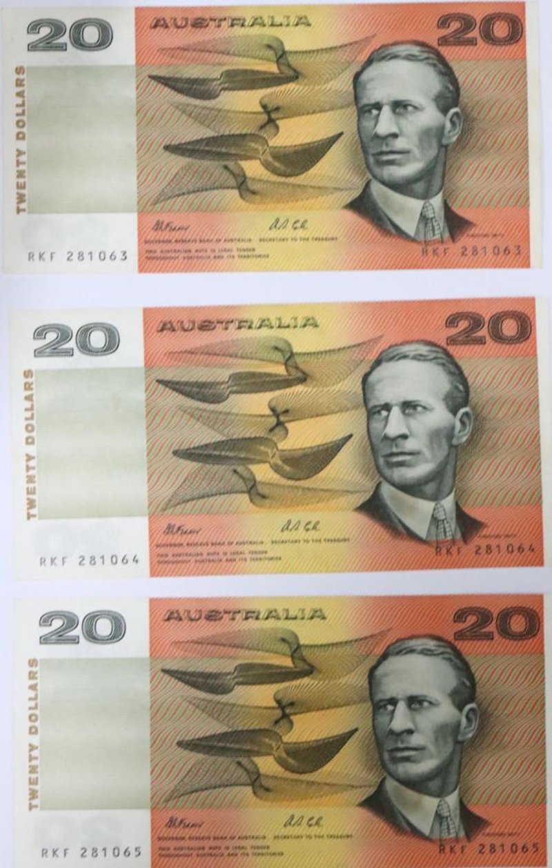 3 X 20 DOLLAR AUSTRALIA BANK NOTE, FRASER/COLE SIGNATURES, MINT CONDITION, UN-CIRCULATED, SEQUENTIAL NUMBERS.RKF 281063RKF 281064RKF 281065 Condition: PRE-OWNED645934+9427