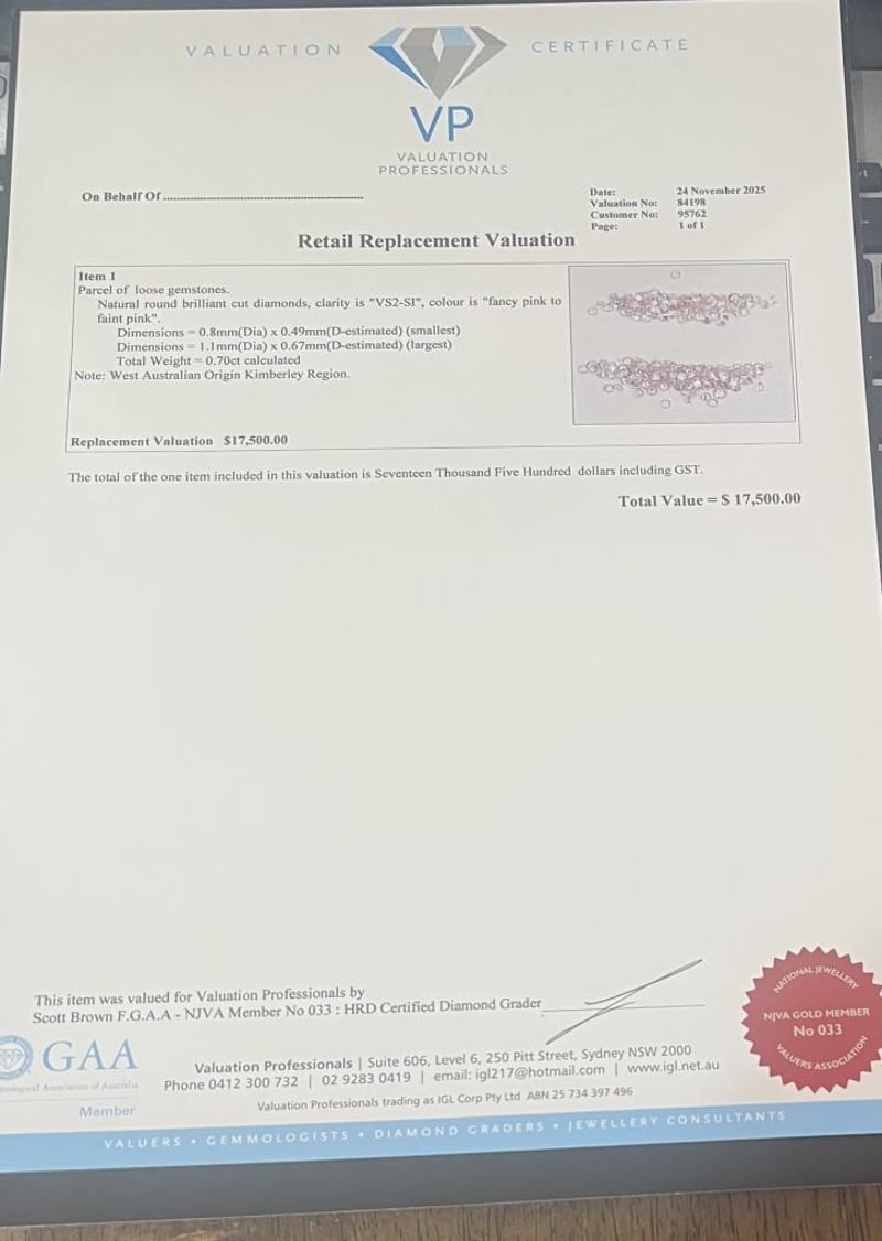 0.70 TCW NATURAL ROUND BRILIANT CUT DIAMONDS FANCY PINK TO FAINT PINK VS2-SI WITH RETAIL REPLACMENT VALUATION $17,500