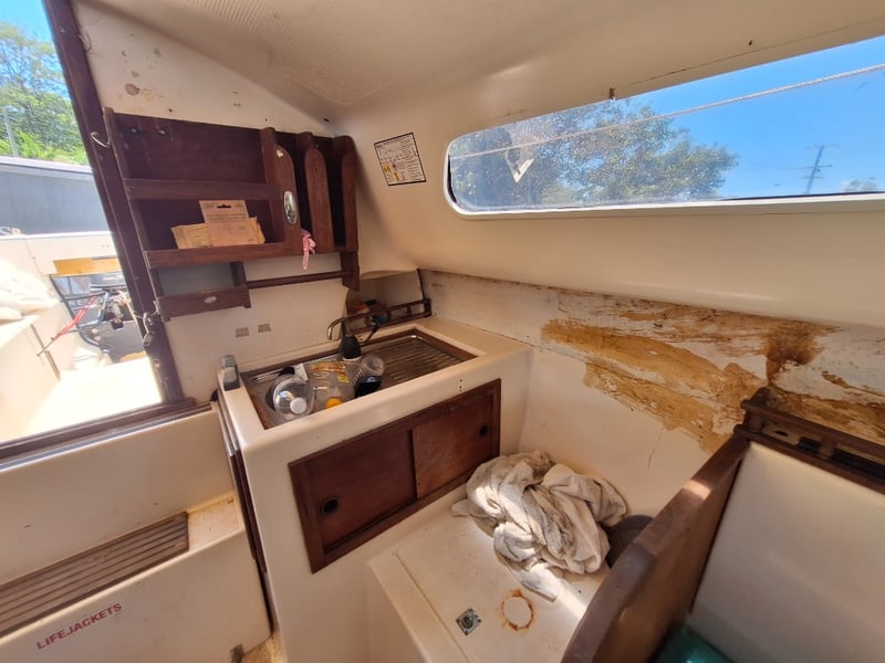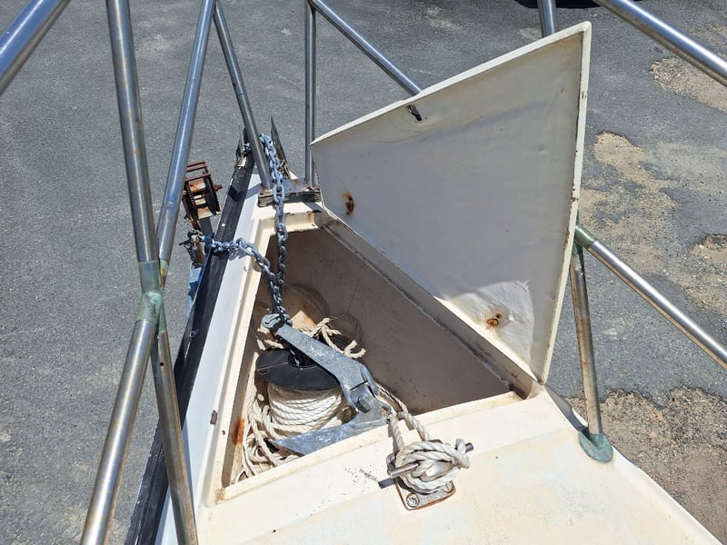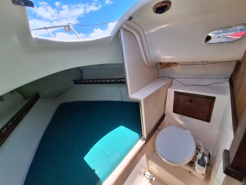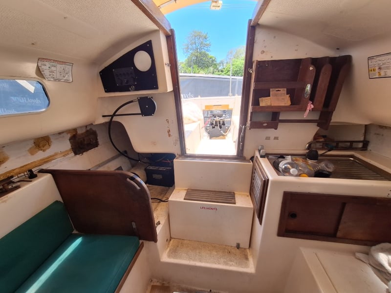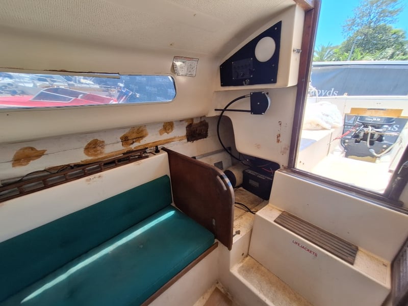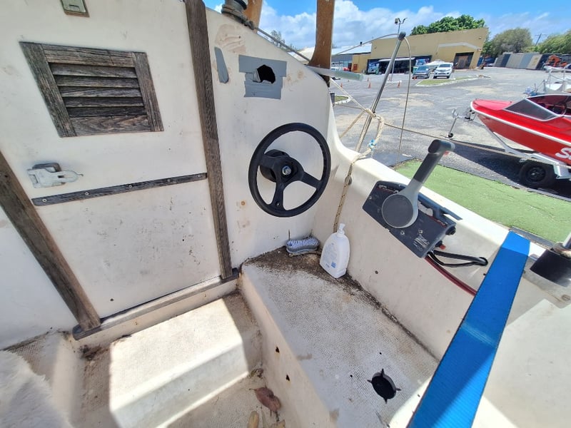 Description: Cabin Cruiser Featuring, Outboard Engine Runs But Steering Does Not Work, Anchor With Chain & Rope, Throttle Controller (Does Not Move Out Of Neutral, Inspection Recommended), Sink, Lounge Area, Sleeping Quarters, Switch Control Panel, Isolator For Battery, Storage Units, Toilet, Outboard With Marine Growth Damage