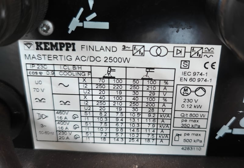 TIG Welder, Mobile Kemppi MasterTig AC/DC 2500W TIG WelderApproximate W82cm H125cm D60m