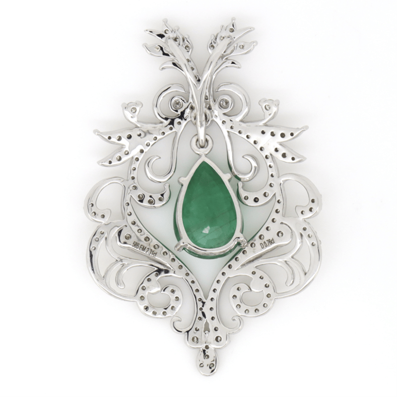 The Design Features, One Pear Cut, Deep Bluish-Green, Emerald (2.31Ct, Heavily Included, Enhanced), 4 Claw Set. Embellishing The Design Are, 139 Round Brilliant Cut, Diamonds (0.76Ct Tdw, G-H Colour, Su1-Si2 Clarity), Micro-Bead Set In White Gold.