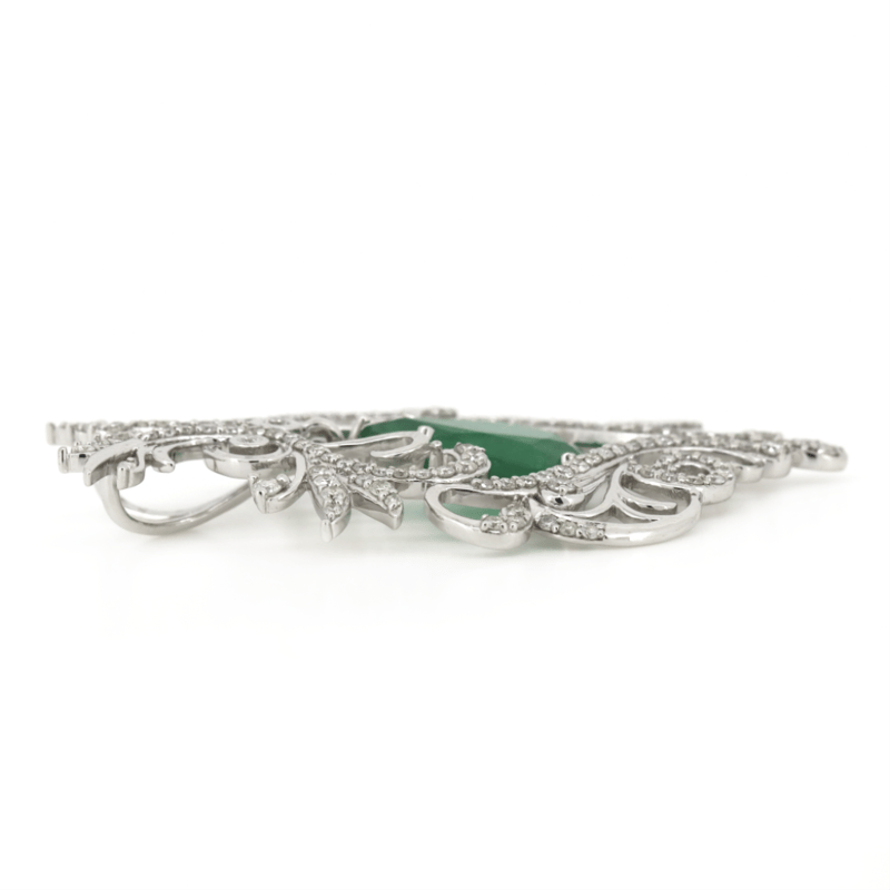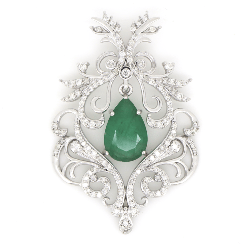 14K WHITE GOLD, EMERALD AND DIAMOND, ORNATE PENDANT.