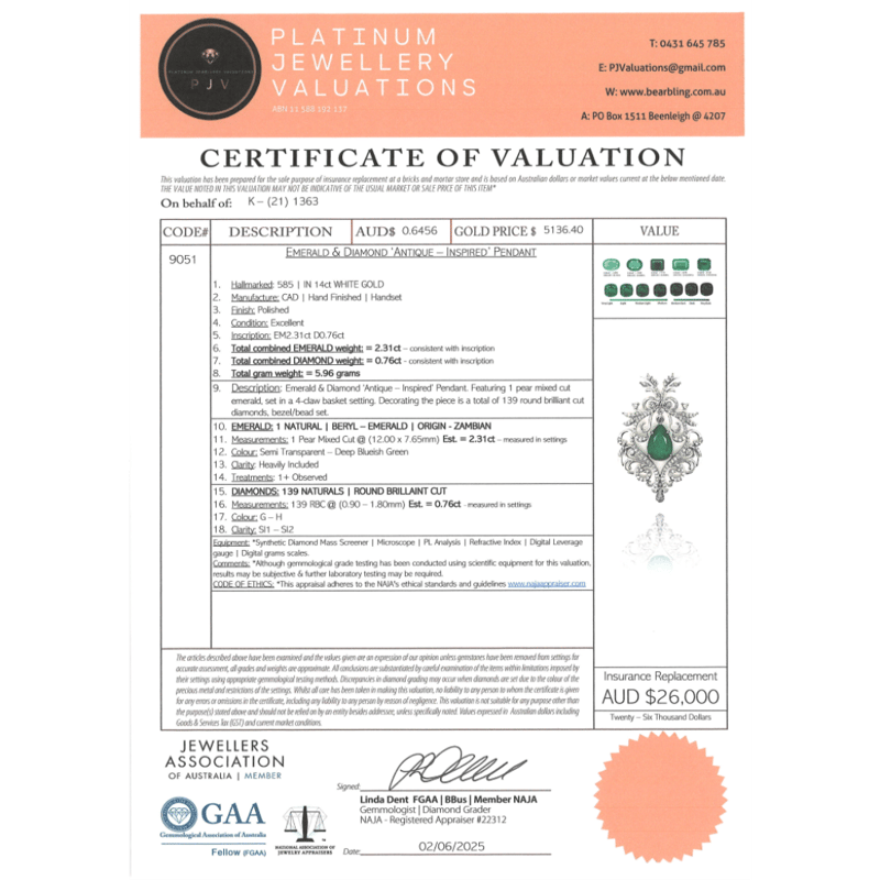 This Insurance Valuation has been provided by a registered Jewellery Valuer and is intended for insurance purposes only. The valuation amount has no bearing on the auction value of the item. Any questions regarding the valuation should be directed to the issuing Valuer (refer to contact details on the certificate) as Lloyds have no association or relationship with the Valuer or the valuation amount contained within the valuation.