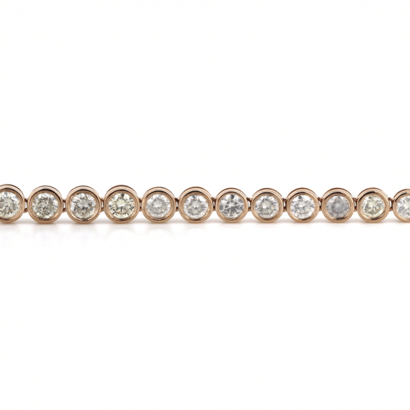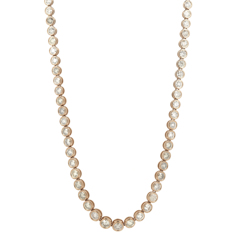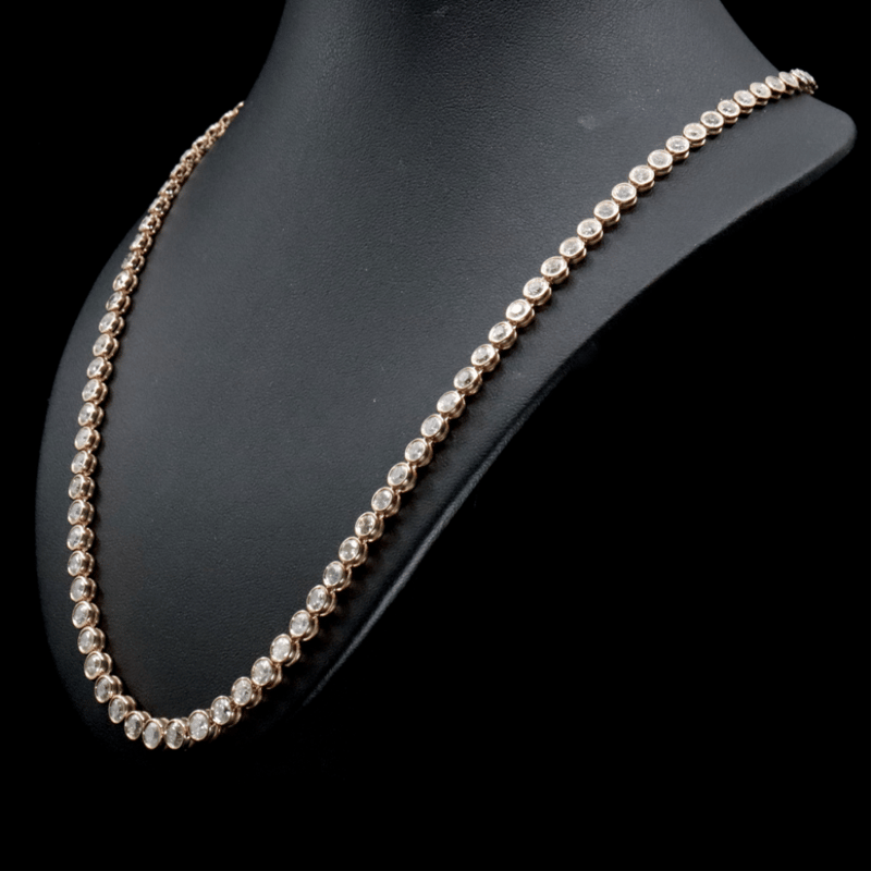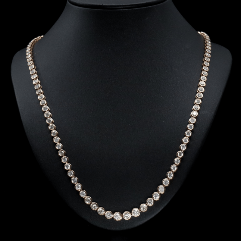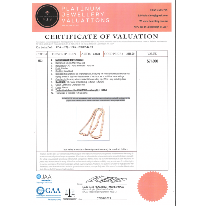 14K ROSE GOLD, 14.88CT TDW CHAMPAGNE DIAMOND, RIVIERA NECKLACE. The Design Features, 105 Round Brilliant Cut, Light Fancy Champagne, Diamonds (14.88Ct Tdw, P1+ Clarity), Bezel Set. The Necklace Features A Box Lock Clasp With A Hinged Safety Latch. Necklace Length Is 50Cm. Jewellery Valuations Provided By A Third Party Professional Not Directly Associated With Lloyds Auctions at AUD $71,600.00This Insurance Valuation has been provided by a registered Jewellery Valuer and is intended for insurance purposes only. The valuation amount has no bearing on the auction value of the item. Any questions regarding the valuation should be directed to the issuing Valuer (refer to contact details on the certificate) as Lloyds have no association or relationship with the Valuer or the valuation amount contained within the valuation. Condition: NEW 0645687+5069