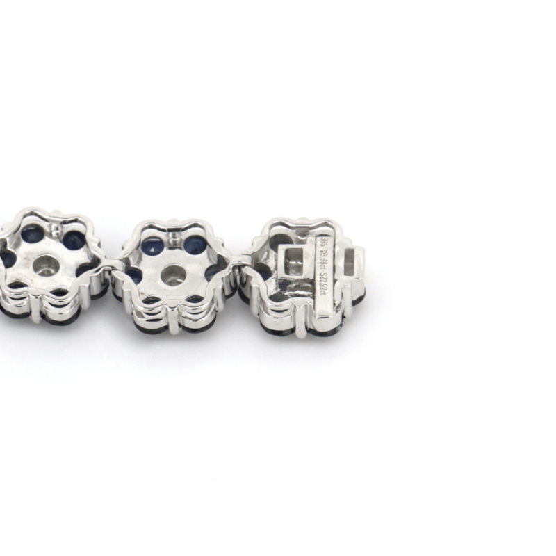 The Design Features, 16 Round Brilliant Cut, Diamonds (3.68Ct Tdw, K-M Colour, Si1-Si2 Clarity), Pip-Claw Set. Surrounding The Centres Are, 96 Round Mixed Cut, Moderate Deep Blue, Sapphires (22.92Ct Tsw, Minor Eye Visible Inclusions), Bezel Set. The Bracelet Features Box Clasp Closure, Bracelet Length 17.5Cm.