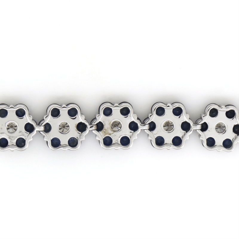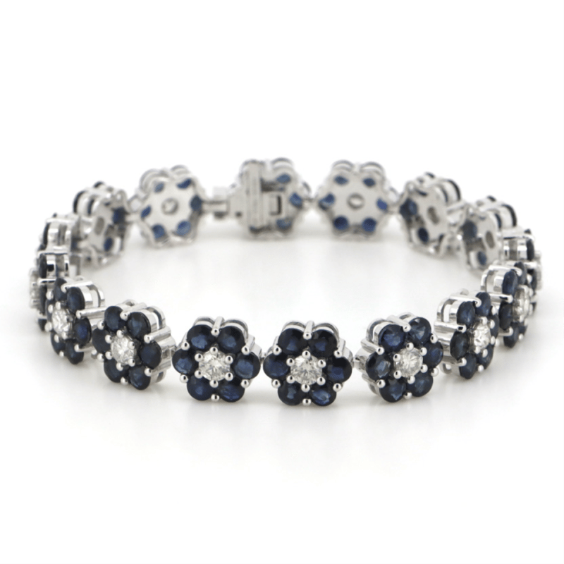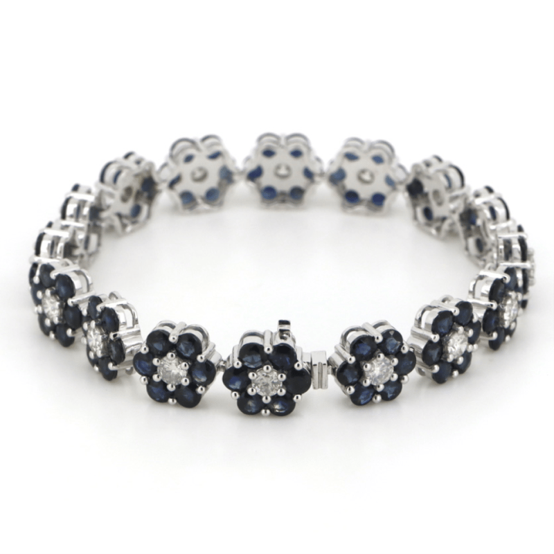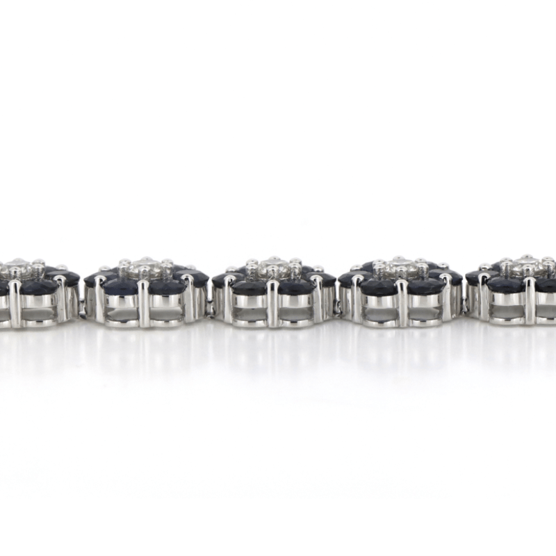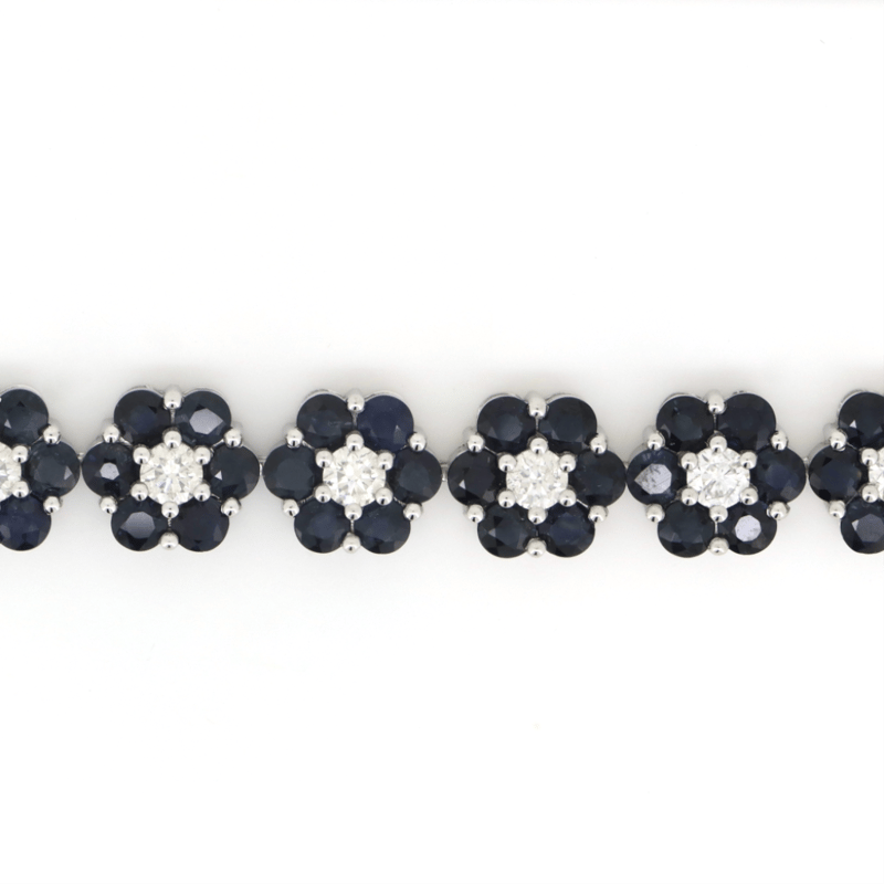 14K WHITE GOLD, BLUE CORUNDUM SAPPHIRE AND DIAMOND, FLORAL BRACELET.