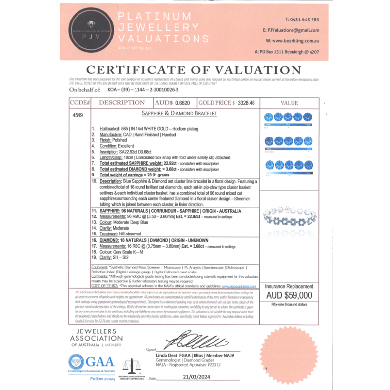 This Insurance Valuation has been provided by a registered Jewellery Valuer and is intended for insurance purposes only. The valuation amount has no bearing on the auction value of the item. Any questions regarding the valuation should be directed to the issuing Valuer (refer to contact details on the certificate) as Lloyds have no association or relationship with the Valuer or the valuation amount contained within the valuation.