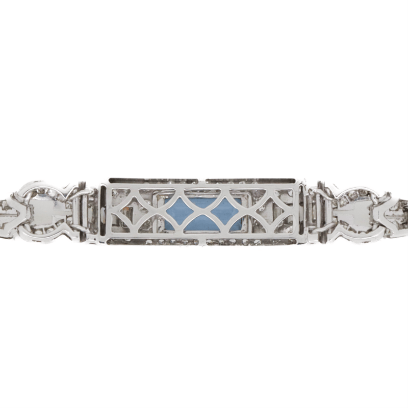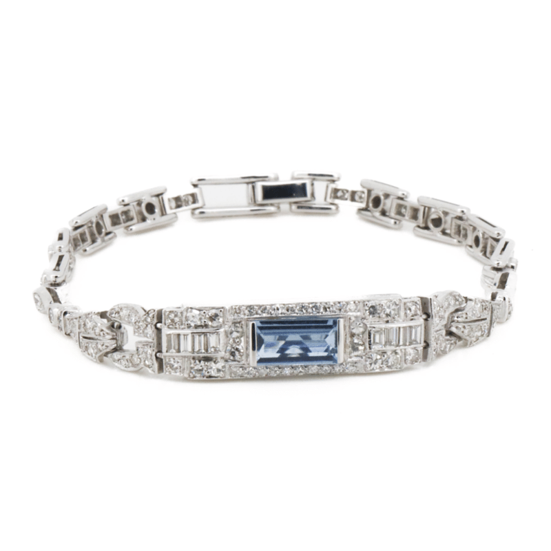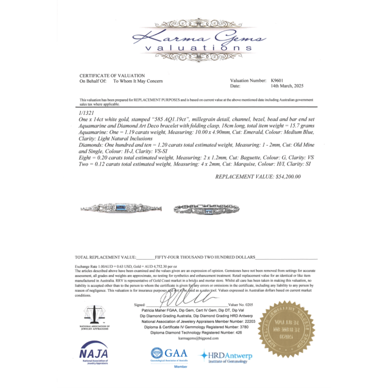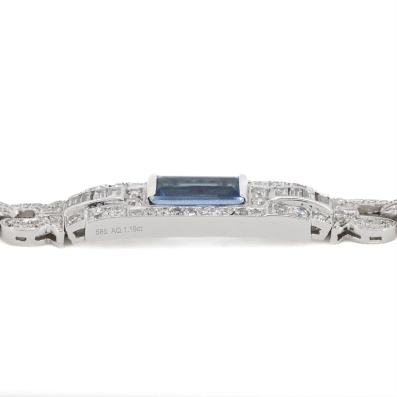 14K WHITE GOLD, AQUAMARINE AND DIAMOND, ART DECO BRACELET. The Centre Features, One Emerald Cut, Medium Blue, Aquamarine (1.19Ct, Light Natural Inclusions Clarity), Bar Set. Encompassing The Design Are, 110 Old Mine And Single Cut, Diamonds (1.20Ct Tdw, H-J Colour, Vs-Si Clarity), Bead/Bezel And Pip Claw Set. Along With, 8 Baguette Cut, Diamonds (0.20Ct Tdw, G Colour, Vs Clarity), Channel Set. Accompanied By, 2 Marquise Cut, Diamonds (0.12Ct Tdw, H-I Colour, Si Clarity), Bezel Set. The Bracelet Features Fold Over Clasp. Bracelet Length Is 18Cm. Jewellery Valuations Provided By A Third Party Professional Not Directly Associated With Lloyds Auctions at AUD $54,200.00This Insurance Valuation has been provided by a registered Jewellery Valuer and is intended for insurance purposes only. The valuation amount has no bearing on the auction value of the item. Any questions regarding the valuation should be directed to the issuing Valuer (refer to contact details on the certificate) as Lloyds have no association or relationship with the Valuer or the valuation amount contained within the valuation. Condition: NEW 0645687+5012