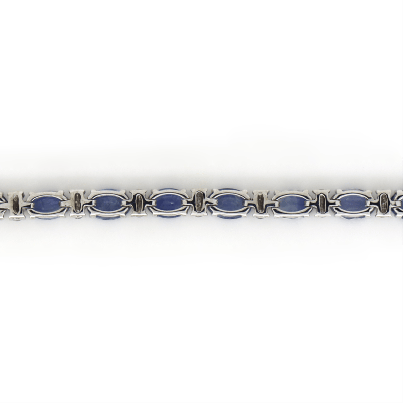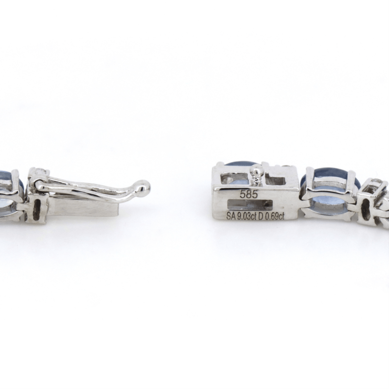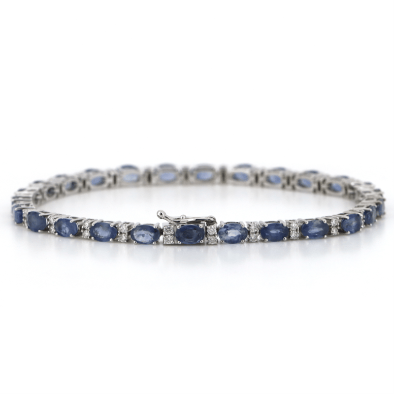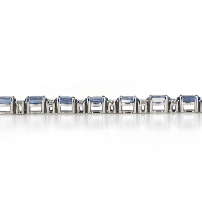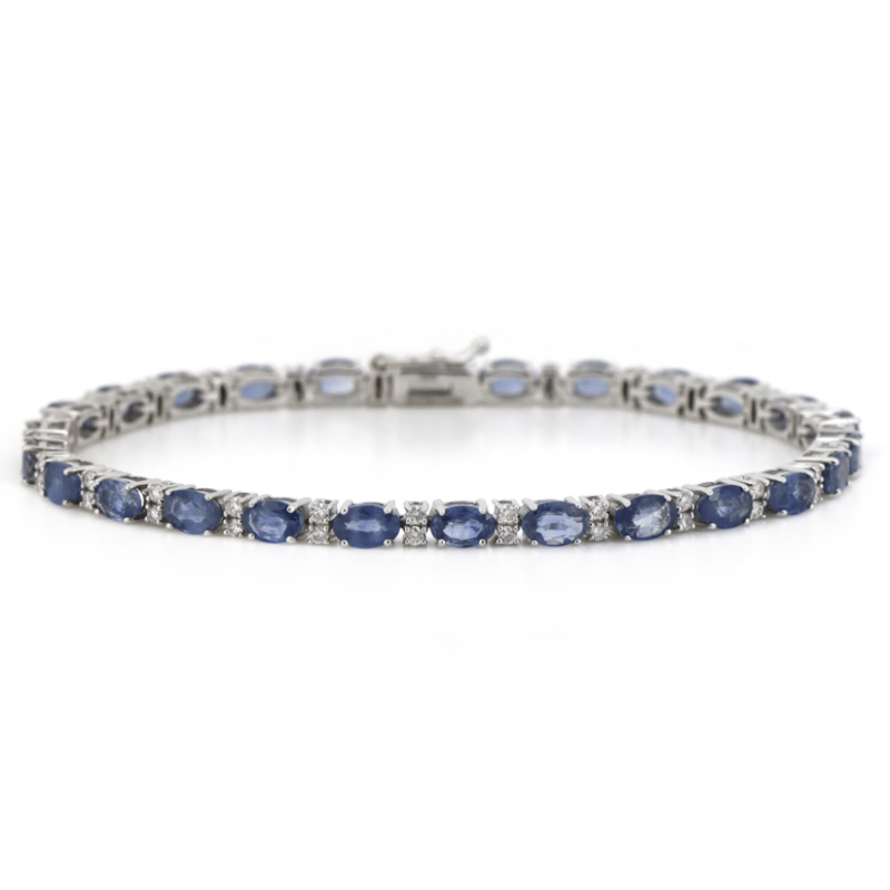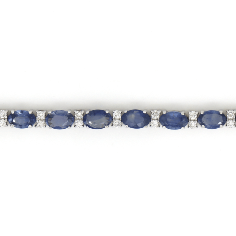 The Design Features, 26 Oval Cut, Weak Moderate Blue, Sapphires (9.03Ct Tsw, Slightly Included), 4 Claw Set. Alternating Between Are, 52 Round Brilliant Cut, Diamonds (0.69Ct Tdw, G-H Colour, Si1-Si2 Clarity), Claw Set. The Bracelet Has A Box Lock Clasp, With One Figure '8' Safety Latch. Bracelet Length Is 18.5 Cm.