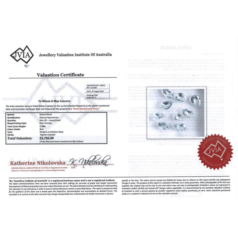 5.59CT TSW X 9, NATURAL BERYL AQUAMARINES Pear Faceted Cut, Medium Light-Medium Deep Blue, Minor Inclusions-Slightly Included, Loose, Unset. Jewellery Valuations Provided By A Third Party Professional Not Directly Associated With Lloyds Auctions at AUD $$3,750.00This Insurance Valuation has been provided by a registered Jewellery Valuer and is intended for insurance purposes only. The valuation amount has no bearing on the auction value of the item. Any questions regarding the valuation should be directed to the issuing Valuer (refer to contact details on the certificate) as Lloyds have no association or relationship with the Valuer or the valuation amount contained within the valuation. Condition: NEW 0+2054