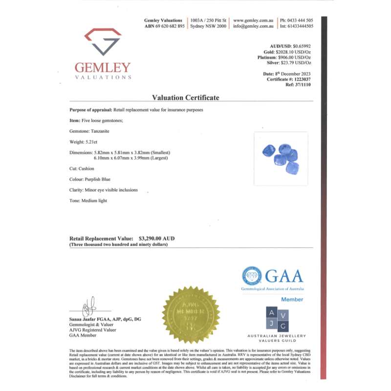 This Insurance Valuation has been provided by a registered Jewellery Valuer and is intended for insurance purposes only. The valuation amount has no bearing on the auction value of the item. Any questions regarding the valuation should be directed to the issuing Valuer (refer to contact details on the certificate) as Lloyds have no association or relationship with the Valuer or the valuation amount contained within the valuation.