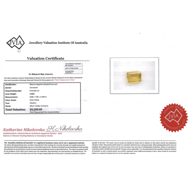 2.52CT NATURAL YELLOW CORUNDUM SAPPHIRE Emerald Cut, Vivid Yellow, Minor Visible Inclusions, Loose, Unset. Jewellery Valuations Provided By A Third Party Professional Not Directly Associated With Lloyds Auctions at AUD $$4,200.00This Insurance Valuation has been provided by a registered Jewellery Valuer and is intended for insurance purposes only. The valuation amount has no bearing on the auction value of the item. Any questions regarding the valuation should be directed to the issuing Valuer (refer to contact details on the certificate) as Lloyds have no association or relationship with the Valuer or the valuation amount contained within the valuation. Condition: NEW 0+2082