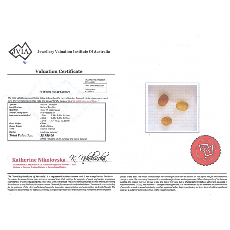 4.39CT TSW X 3, NATURAL YELLOW CORUNDUM SAPPHIRES Oval Faceted Cut, Medium-Deep Golden Yellow, Moderate Inclusions, Loose, Unset. Jewellery Valuations Provided By A Third Party Professional Not Directly Associated With Lloyds Auctions at AUD $$3,780.00This Insurance Valuation has been provided by a registered Jewellery Valuer and is intended for insurance purposes only. The valuation amount has no bearing on the auction value of the item. Any questions regarding the valuation should be directed to the issuing Valuer (refer to contact details on the certificate) as Lloyds have no association or relationship with the Valuer or the valuation amount contained within the valuation. Condition: NEW 0+2068