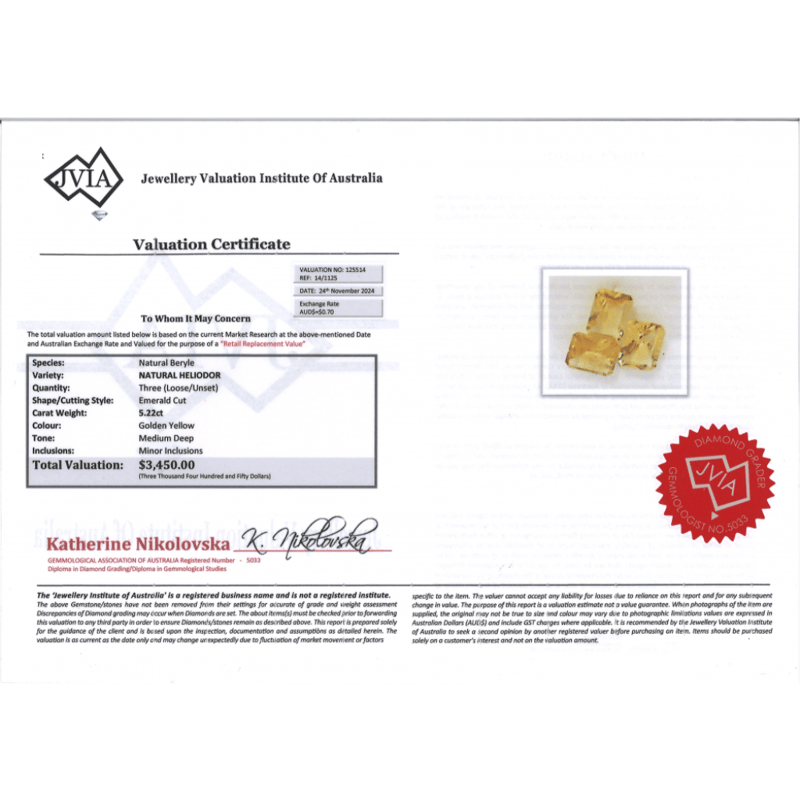5.22CT TSW X 3, NATURAL GOLDEN BERYL HELIODOR Emerald Cut, Medium Deep Golden Yellow, Minor Eye Visible Inclusions, Loose, Unset. Jewellery Valuations Provided By A Third Party Professional Not Directly Associated With Lloyds Auctions at AUD $$3,450.00This Insurance Valuation has been provided by a registered Jewellery Valuer and is intended for insurance purposes only. The valuation amount has no bearing on the auction value of the item. Any questions regarding the valuation should be directed to the issuing Valuer (refer to contact details on the certificate) as Lloyds have no association or relationship with the Valuer or the valuation amount contained within the valuation. Condition: NEW 0+2027