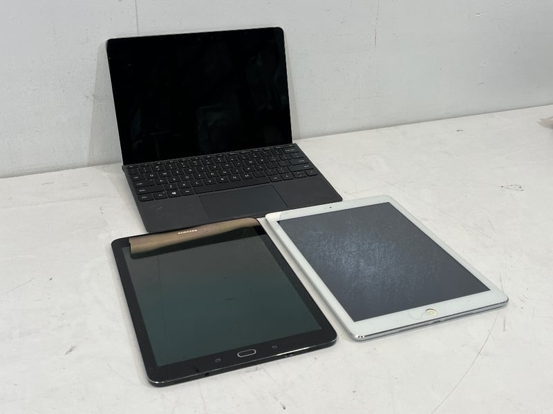 Tablets, included IPad, Samsung and Windows, no chargers, untested, sold as is, crack in one screen