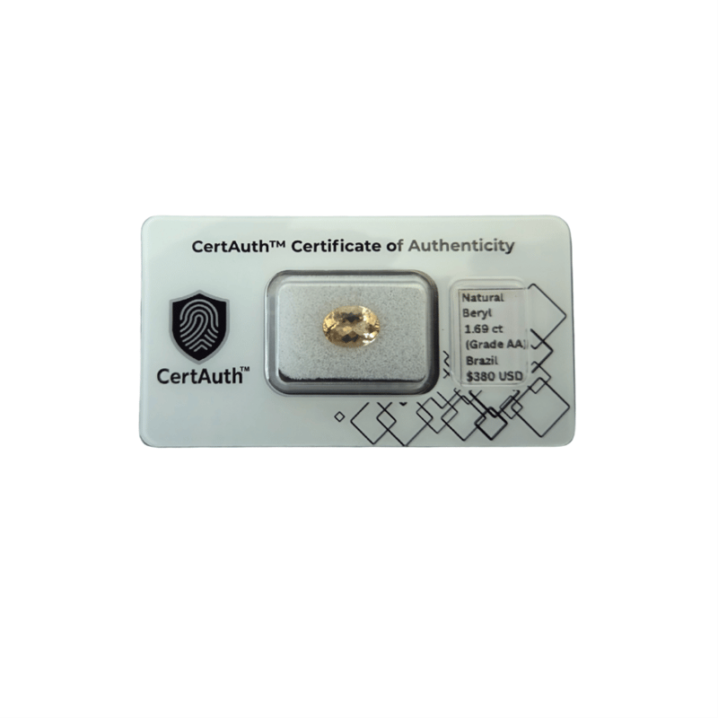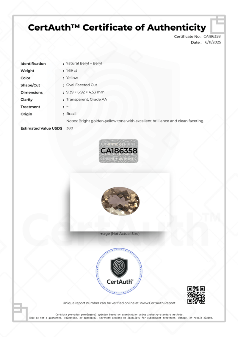 GOLDEN-YELLOW BERYL – 1.69CT, CERTIFIED BY CERTAUTH™ A Beautiful Natural Beryl From Brazil Showcasing A Bright Golden-Yellow Hue With Exceptional Clarity And Lively Brilliance. Expertly Faceted In An Oval Cut To Enhance Its Sparkle And Depth, This Gemstone Displays Refined Transparency And Clean Proportions.Details:• Gemstone: Natural Beryl• Carat Weight: 1.69 Ct• Colour: Yellow (Golden Tone)• Shape/Cut: Oval Faceted Cut• Dimensions: 9.39 × 6.92 × 4.53 Mm• Clarity: Transparent, Grade Aa• Treatment: None• Origin: Brazil• Certification: Certauth™ No. Ca186358• Estimated Value: Usd $380Comments:Bright Golden Beryl With Vivid Saturation And Mirror-Like Luster — Ideal For Fine Jewellery Or As A Collector’S Specimen. Excellent Cutting Symmetry Enhances Light Reflection Across The Stone’S Surface. Valuations Provided by an Independent Third-Party Professional Not Directly Associated With Lloyds Auctions at AUD $$380 USDThis valuation has been conducted by an independent third-party professional. The valuation amount is an assessment by the issuing valuer and does not reflect the auction value of the item. Any inquiries regarding the valuation should be directed to the issuing valuer (refer to contact details on the certificate), as Lloyds Auctions has no affiliation or influence over the valuation, the valuer, or the stated amount. Condition: Good - Refer Images 0488341+186358