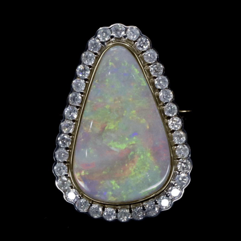 14K YELLOW GOLD, 4.08CT AUSTRALIAN ANDAMOOKA OPAL AND DIAMOND, HALO RING. The Centre Features, One Pear Cabochon Cut, Australian Andamooka Opal (4.08Ct, Green-Violet-Yellow-Blue-Pink Strong Colour Play), Bezel Set. Surrounding The Centre In A Halo Are, 34 Round Brilliant Cut, Diamonds (0.56Ct Tdw, J-K Colour, Si1-Si2 Clarity), Micro-Claw Set In White Gold. Ring Size L 1/2. 14K Yellow Gold, 4.08Ct Australian Andamooka Opal And Diamond, Halo Ring. The Centre Features, One Pear Cabochon Cut, Australian Andamooka Opal (4.08Ct, Green-Violet-Yellow-Blue-Pink Strong Colour Play), Bezel Set. Surrounding The Centre In A Halo Are, 34 Round Brilliant Cut, Diamonds (0.56Ct Tdw, J-K Colour, Si1-Si2 Clarity), Micro-Claw Set In White Gold. Ring Size L 1/2. Jewellery Valuations Provided By A Third Party Professional Not Directly Associated With Lloyds Auctions at AUD $11,490.00This Insurance Valuation has been provided by a registered Jewellery Valuer and is intended for insurance purposes only. The valuation amount has no bearing on the auction value of the item. Any questions regarding the valuation should be directed to the issuing Valuer (refer to contact details on the certificate) as Lloyds have no association or relationship with the Valuer or the valuation amount contained within the valuation. Condition: NEW 0584876+1441