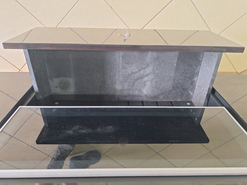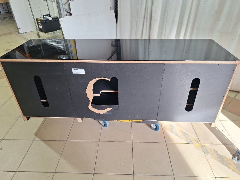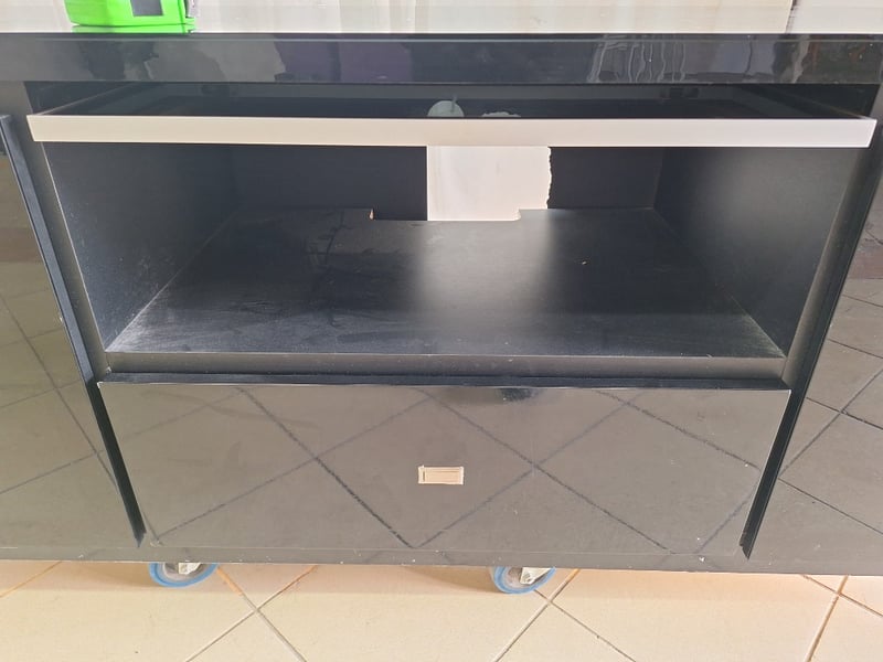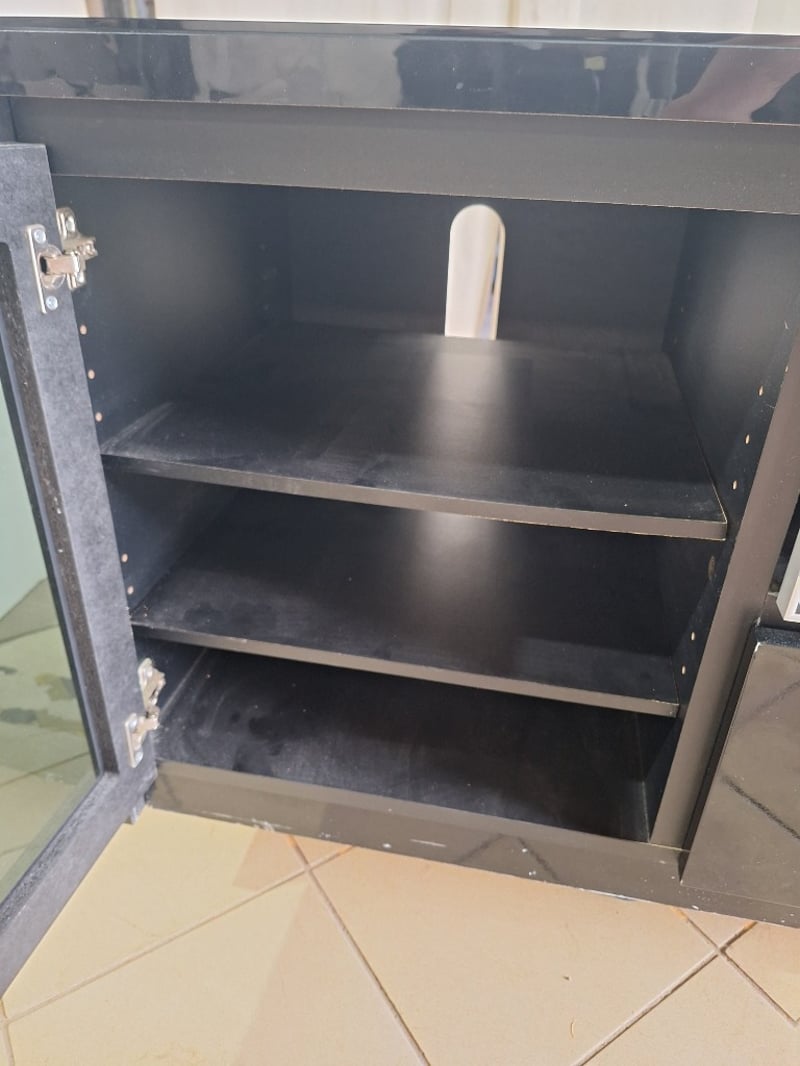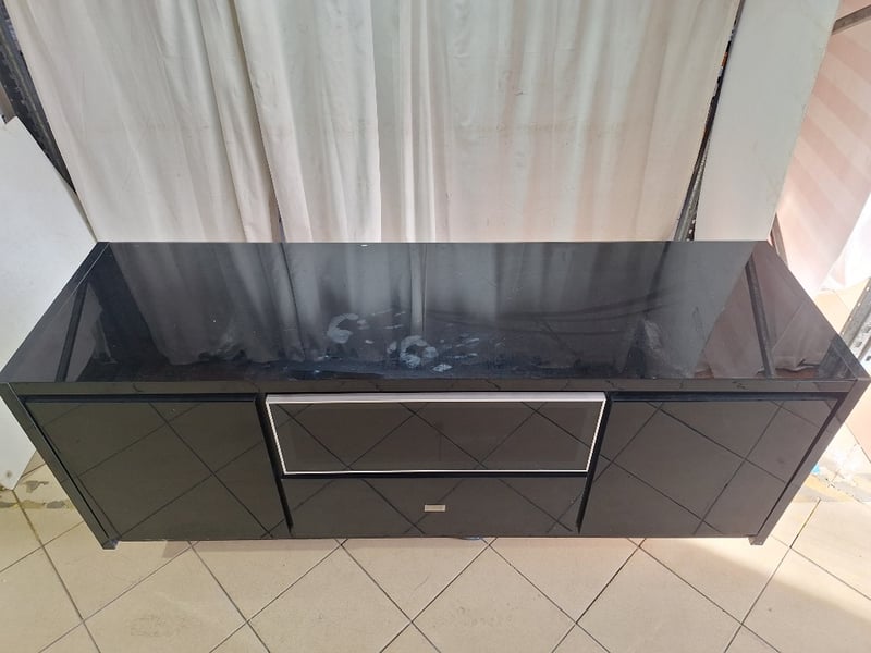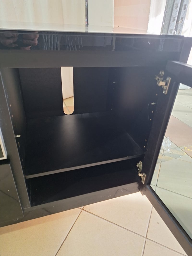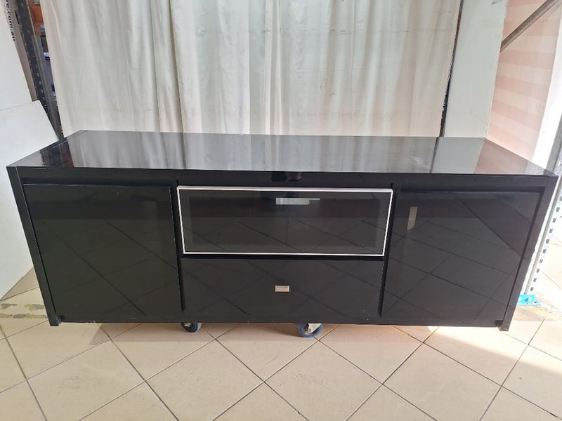 Entertainment Unit With Shelving, Glass Top, Timber Style, Black Finish