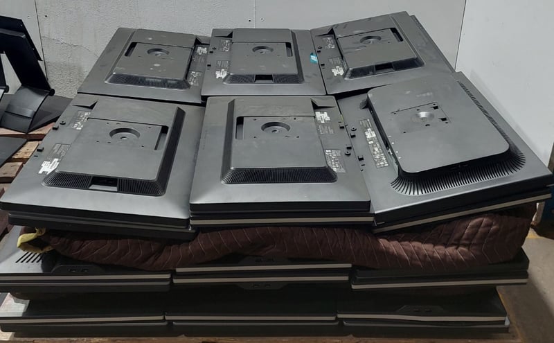 Assorted computer monitors, computer monitor stands.