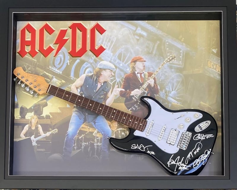 ANGUS YOUNG, BRIAN JOHNSON , CLIFF WILLIAMS, STEVIE YOUNG & CHRIS SLADE (AC/DC) PERSONALLY SIGNED GUITARBox Framed Using A Single Mat And A Backdrop Dseign. Hand Signed By Angus Young, Brian Johnson, Cliff Williams, Stevie Young & Chris Slade Using A Silver MarkerAccompanied By A Certificate Of AuthenticitySize: 89 x 10 x 109Condition: Good - Refer To Images488355+6