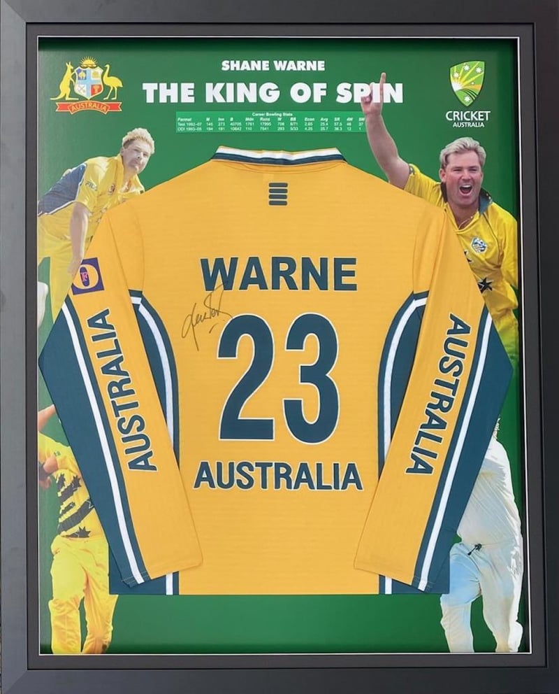 SHANE WARNE PERSONALLY SIGNED ONE DAY CRICKET SHIRT Framed Using Double Mats, 2 Unsigned Photographs And A Plaque. Hand Signed By Shane Warne Using A Black MarkerAccompanied By A Certificate Of AuthenticitySize: 109 x 7 x 89Condition: Good - Refer To Images488355+13