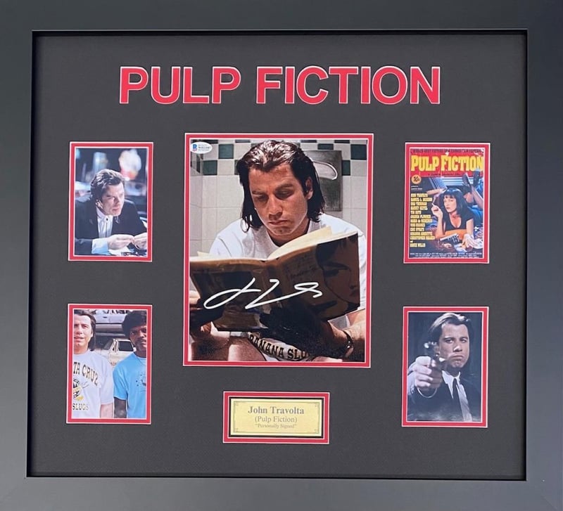 JOHN TRAVOLTA (PULP FICTION) PERSOANLLY SIGNED 10" X 8" PHOTOGRAPH Framed Using Double Mats, 4 Unsigned Photographs And A Plaque. Hand Signed By John Travolta Using A Silver MarkerAccompanied By A Certificate Of Authenticity From BeckettSize: 63 x 2 x 57Condition: Good - Refer To Images488355+16