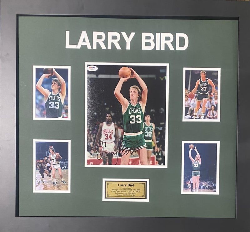 LARRY BIRD PERSOANLLY SIGNED 10" X 8" PHOTOGRAPH Framed Using Double Mats, 4 Unsigned Photographs And A Plaque. Hand Signed By Larry Bird Using A Black MarkerAccompanied By A Certificate Of Authenticity From Psa/DnaSize: 63 x 2 x 57Condition: Good - Refer To Images488355+19