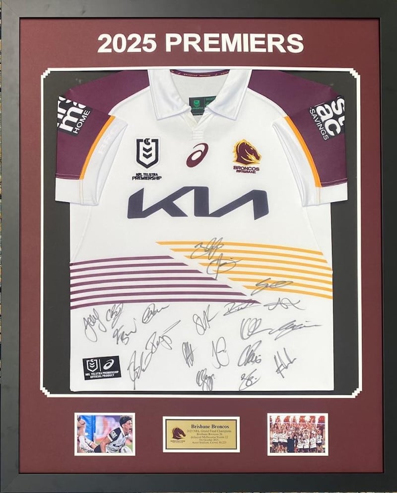 2025 BRISBANE BRONCOS PERSONALLY SIGNED JERSEY (2025 NRL GRAND FINAL CHAMPIONS) Framed Using Double Mats, 2 Unsigned Photographs And A Plaque. Hand Signed By 20 Members Of The 2025 Brisbane Broncos Squad Using A Black Marker Accompanied By A Certificate Of Authenticity Size: 109 x 2 x 89 Condition: Good - Refer To Images 488355+1