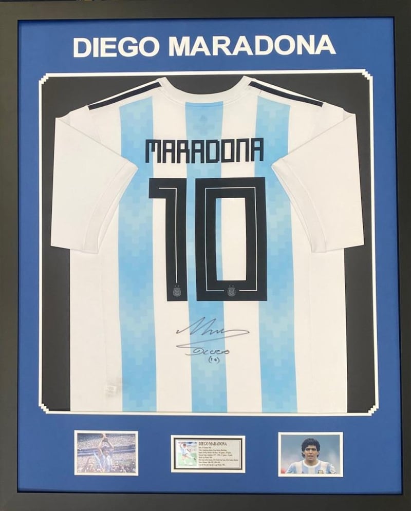 DIEGO MARADONA PERSONALLY SIGNED ARGENTINIAN JERSEY Framed Using Double Mats, 2 Unsigned Photographs And A Plaque. Hand Signed By Diego Maradona Using A Black MarkerAccompanied By A Certificate Of AuthenticitySize: 109 x 2 x 89Condition: Good - Refer To Images488355+22