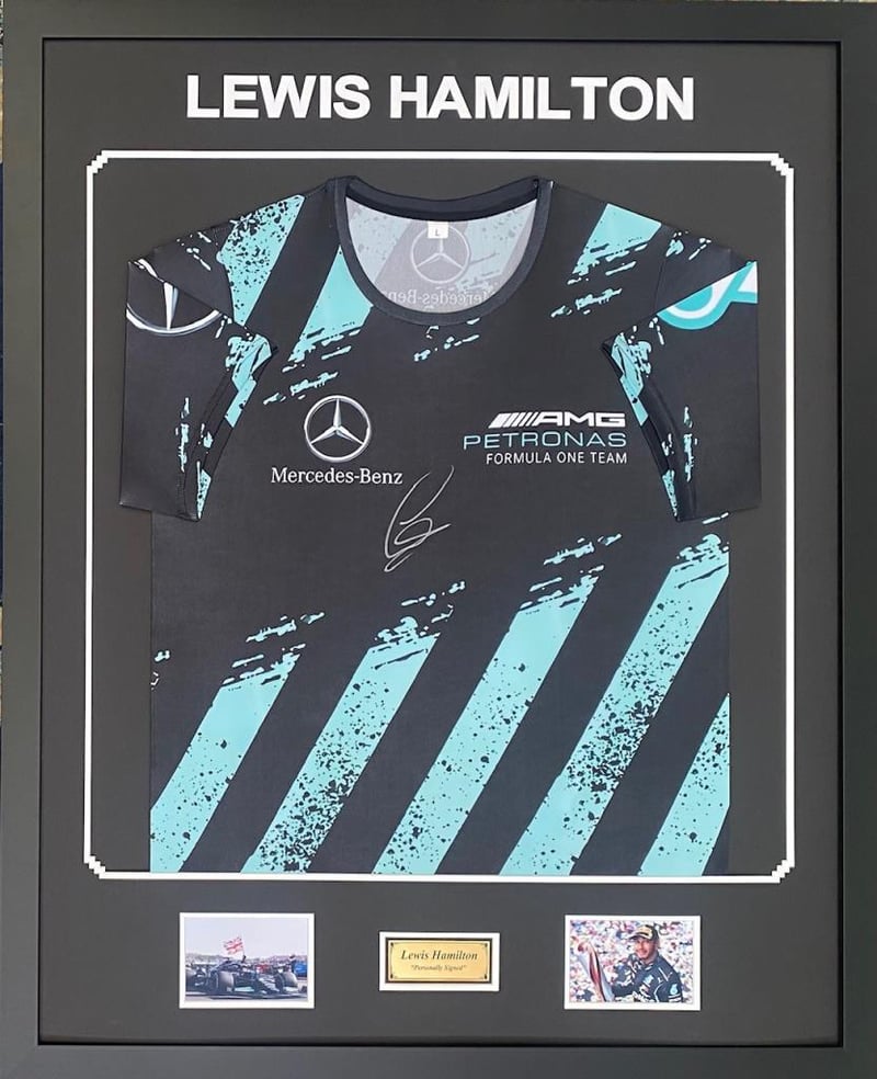 LEWIS HAMILTON PERSONALLY SIGNED REPLICA PIT SHIRTFramed Using Double Mats, 2 Unsigned Photographs And A Plaque. Hand Signed By Lewis Hamilton Using A Silver MarkerAccompanied By A Certificate Of AuthenticitySize: 109 x 2 x 89Condition: Good - Refer To Images488355+14