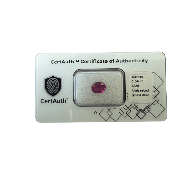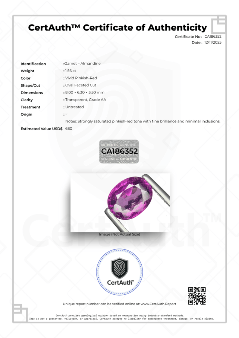 VIVID PINKISH-RED GARNET – 1.56CT, CERTIFIED BY CERTAUTH An Exquisite Vivid Pinkish-Red Almandine Garnet Showcasing Strong Saturation And Lively Brilliance. Expertly Faceted In An Oval Cut, This Untreated Gem Displays Rich Colour Depth And Minimal Inclusions — A Fine Representation Of Premium Garnet Quality.Details:• Gemstone: Garnet – Almandine• Weight: 1.56 Ct• Colour: Vivid Pinkish-Red• Shape/Cut: Oval Faceted Cut• Dimensions: 8.00 × 6.30 × 3.50 Mm• Clarity: Transparent, Grade Aa• Treatment: Untreated• Origin: ~• Certification: Certauth No. Ca186352• Estimated Value: Usd $680Comments:Strongly Saturated Pinkish-Red Tone With Fine Brilliance And Minimal Inclusions — A Perfect Centre Stone For A High-End Ring Or Pendant Setting. Condition: Good - Refer Images 0488342+186352