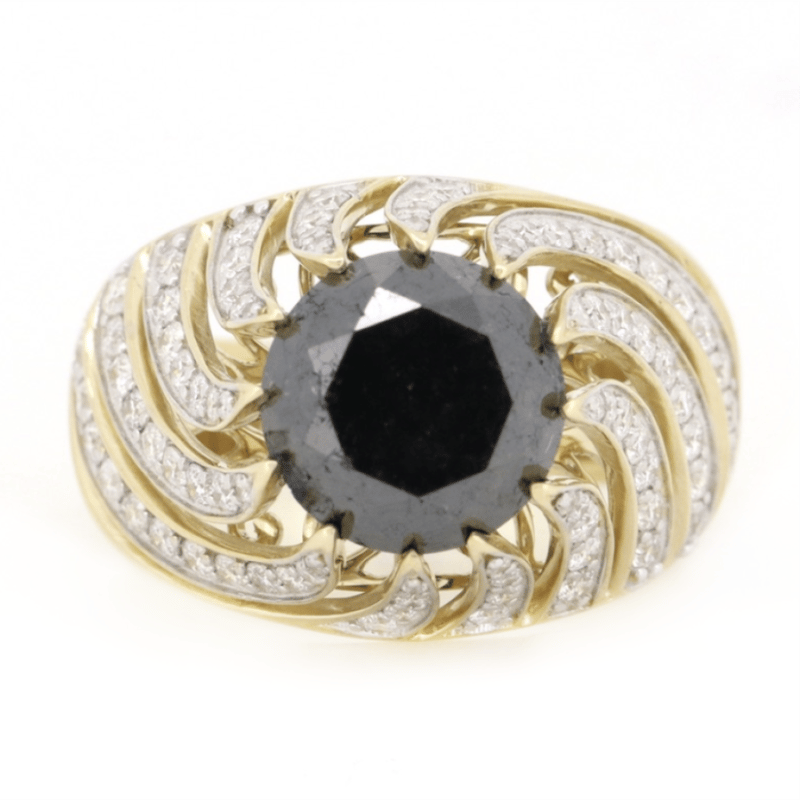 14K Yellow Gold, Black Diamond And Diamond, Split Swirl Ring. The Centre Features, One Round Brilliant Cut, Black, Diamond (4.84Ct, Opaque), Multi-Claw Set. Encompassing The Centre Are, 84 Round Brilliant Cut, Diamonds (0.90Ct Tdw, H-I Colour, Si-I2 Clarity), Micro-Bead Set. Ring Size O.