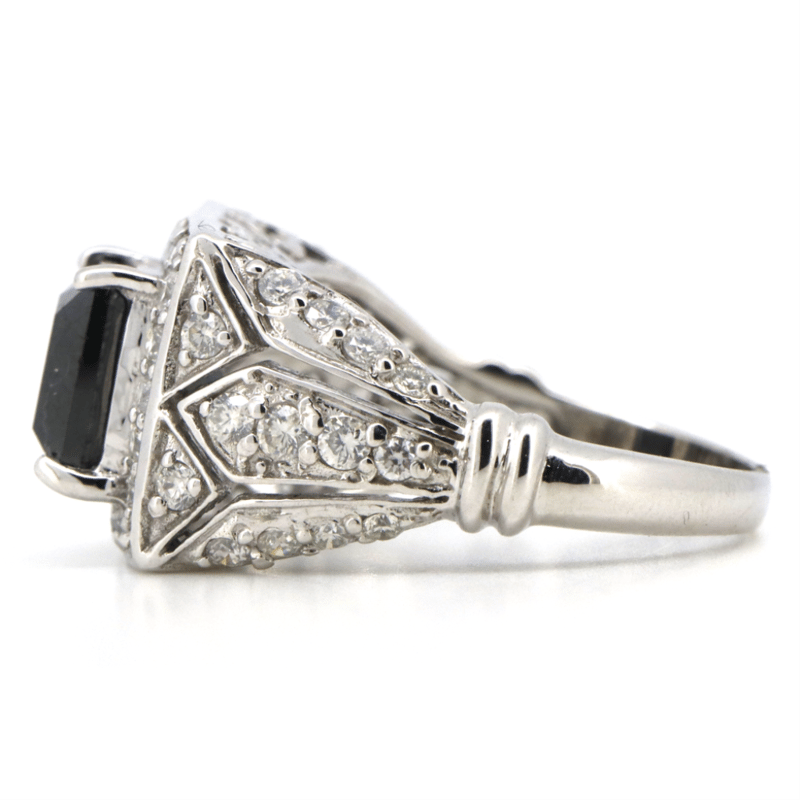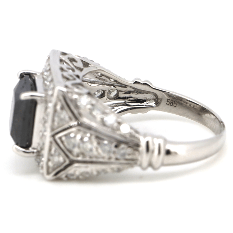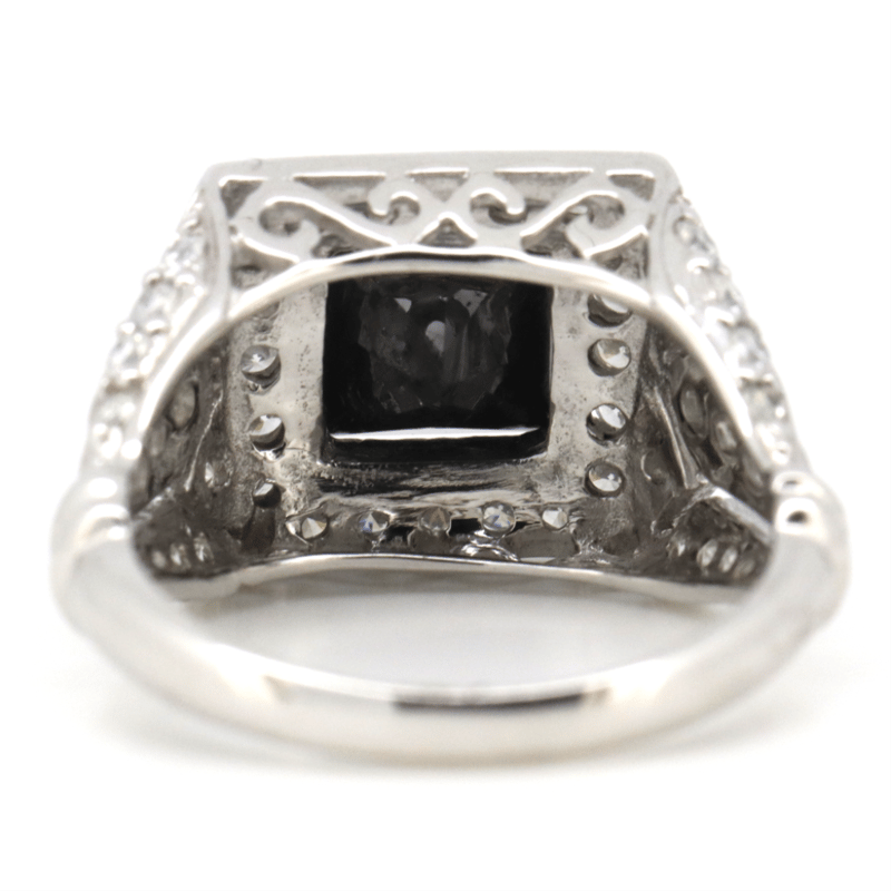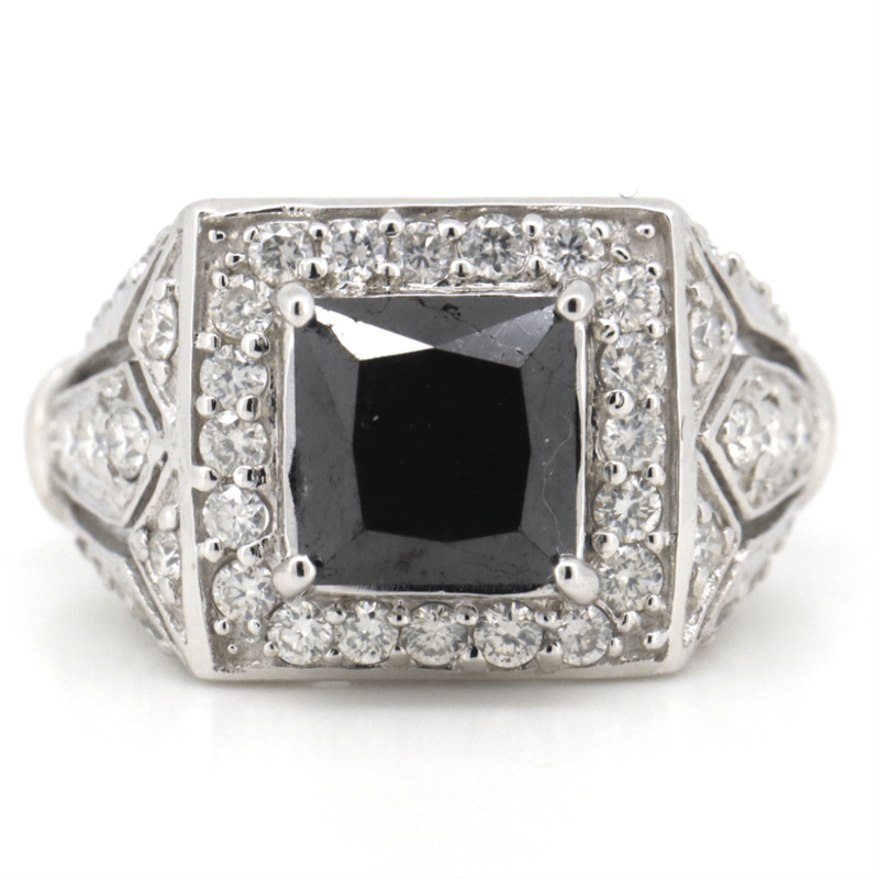 The Centre Features, One Princess Cut, Black, Diamond (2.69Ct, Opaque), 4 Claw Set. Encompassing The Centre Are, 48 Round Brilliant Cut, Diamonds (0.86Ct Tdw, H-J Colour, Si Clarity), Bead Set. Ring Size L.