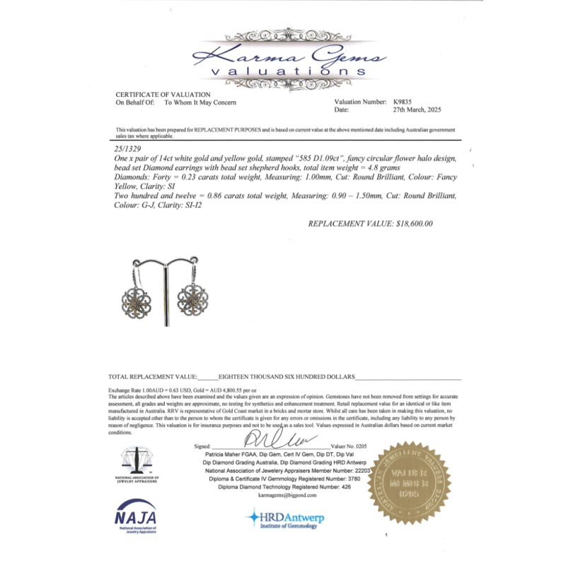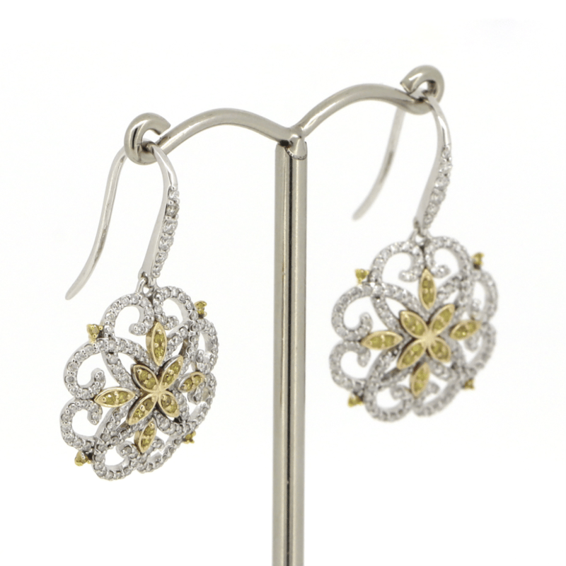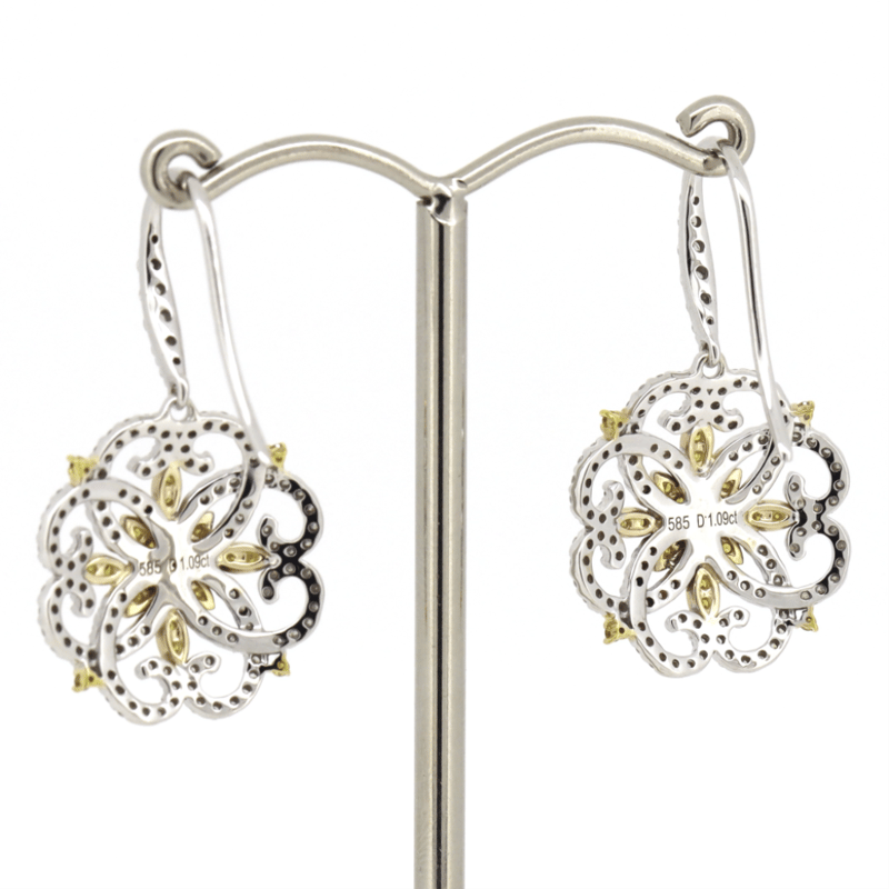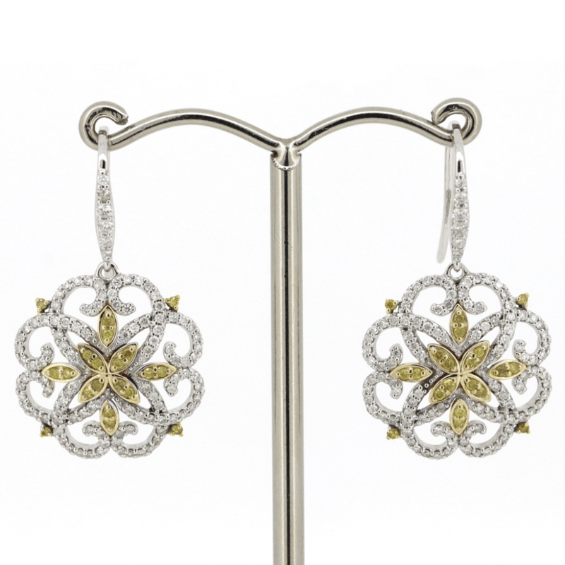 14K WHITE/YELLOW GOLD, FANCY YELLOW DIAMOND AND DIAMOND, DROP EARRINGS. The Design Features, 40 Round Brilliant Cut, Fancy Yellow, Diamonds (0.23Ct Tdw, Si Clarity), Bezel/Micro-Bead Set In Yellow Gold. Encompassing The Design And Decorating The Hooks Are, 212 Round Brilliant Cut, Diamonds (0.86Ct Tdw, G-J Colour, Si-I2 Clarity), Micro-Bead/Bezel Set In White Gold. The Earrings Have Shepherd Hooks. 14K White/Yellow Gold, Fancy Yellow Diamond And Diamond, Drop Earrings. The Design Features, 40 Round Brilliant Cut, Fancy Yellow, Diamonds (0.23Ct Tdw, Si Clarity), Bezel/Micro-Bead Set In Yellow Gold. Encompassing The Design And Decorating The Hooks Are, 212 Round Brilliant Cut, Diamonds (0.86Ct Tdw, G-J Colour, Si-I2 Clarity), Micro-Bead/Bezel Set In White Gold. The Earrings Have Shepherd Hooks. Jewellery Valuations Provided By A Third Party Professional Not Directly Associated With Lloyds Auctions at AUD $18,600.00This Insurance Valuation has been provided by a registered Jewellery Valuer and is intended for insurance purposes only. The valuation amount has no bearing on the auction value of the item. Any questions regarding the valuation should be directed to the issuing Valuer (refer to contact details on the certificate) as Lloyds have no association or relationship with the Valuer or the valuation amount contained within the valuation. Condition: NEW 0645883+5082