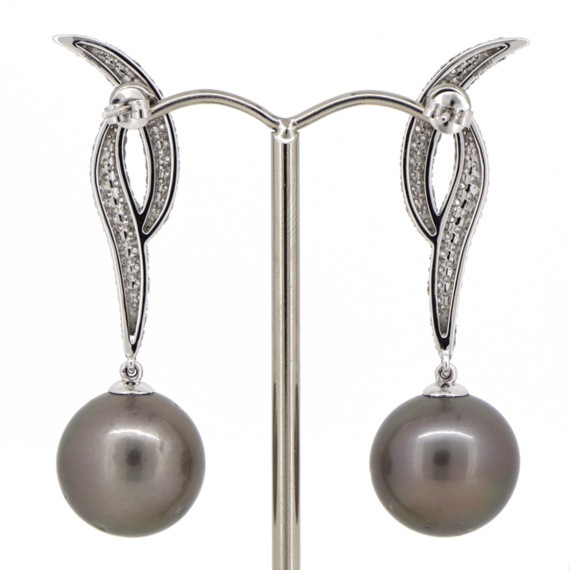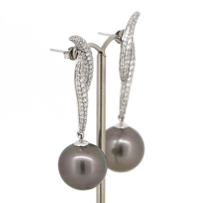 14K WHITE GOLD, BLACK CULTURED TAHITIAN PEARL AND DIAMOND, DROP EARRINGS. The Earrings Feature, 2 Round, Grey/Black With Silver Overtones, Cultured Tahitian Pearls (15.60Mm Size, Lightly Blemished). Decorating The Drops Are, 258 Round Brilliant Cut, Diamonds (2.40Ct Tdw, H-I Colour, Si-I2 Clarity), Micro-Claw Set. The Earrings Comes With Posts And 14K White Gold Butterfly Clasps. 14K White Gold, Black Cultured Tahitian Pearl And Diamond, Drop Earrings. The Earrings Feature, 2 Round, Grey/Black With Silver Overtones, Cultured Tahitian Pearls (15.60Mm Size, Lightly Blemished). Decorating The Drops Are, 258 Round Brilliant Cut, Diamonds (2.40Ct Tdw, H-I Colour, Si-I2 Clarity), Micro-Claw Set. The Earrings Comes With Posts And 14K White Gold Butterfly Clasps. Jewellery Valuations Provided By A Third Party Professional Not Directly Associated With Lloyds Auctions at AUD $35,500.00This Insurance Valuation has been provided by a registered Jewellery Valuer and is intended for insurance purposes only. The valuation amount has no bearing on the auction value of the item. Any questions regarding the valuation should be directed to the issuing Valuer (refer to contact details on the certificate) as Lloyds have no association or relationship with the Valuer or the valuation amount contained within the valuation. Condition: NEW 0645883+5027