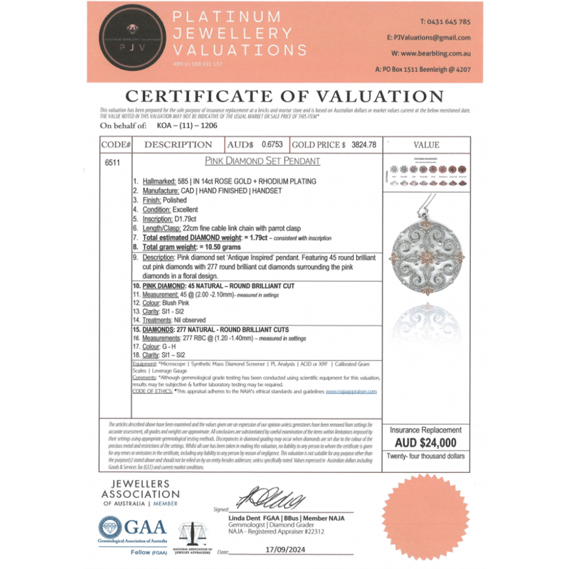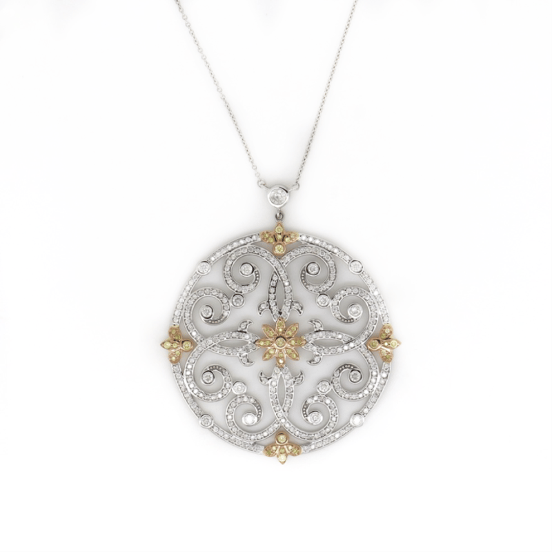 14K WHITE/YELLOW GOLD, FANCY YELLOW DIAMOND AND DIAMOND, ART DECO INSPIRED NECKLACE. The Pendant Features, 45 Round Brilliant Cut, Fancy Yellow, Diamonds (0.258Ct Tdw, Si1-Si2 Clarity), Bezel Set. Encompassing The Design Are, 277 Round Brilliant Cut, Diamonds (1.502Ct Tdw, G-H Colour, Si1-Si2 Clarity), Bezel Set On A Fine Cable Link With A Parrot Clasp. Chain Length Is 44Cm. 14K White/Yellow Gold, Fancy Yellow Diamond And Diamond, Art Deco Inspired Necklace. The Pendant Features, 45 Round Brilliant Cut, Fancy Yellow, Diamonds (0.258Ct Tdw, Si1-Si2 Clarity), Bezel Set. Encompassing The Design Are, 277 Round Brilliant Cut, Diamonds (1.502Ct Tdw, G-H Colour, Si1-Si2 Clarity), Bezel Set On A Fine Cable Link With A Parrot Clasp. Chain Length Is 44Cm. Jewellery Valuations Provided By A Third Party Professional Not Directly Associated With Lloyds Auctions at AUD $24,000.00This Insurance Valuation has been provided by a registered Jewellery Valuer and is intended for insurance purposes only. The valuation amount has no bearing on the auction value of the item. Any questions regarding the valuation should be directed to the issuing Valuer (refer to contact details on the certificate) as Lloyds have no association or relationship with the Valuer or the valuation amount contained within the valuation. Condition: NEW 0645883+5080