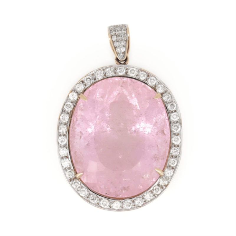 14K ROSE GOLD, 46.38CT MORGANITE AND DIAMOND, STATEMENT PENDANT. The Centre Features, One Oval Cut, Strong Pale Pink, Morganite (46.38Ct, Heavily Included), 4 Claw Set. Surrounding The Centre In A Halo And Decorating The Bail Are, 52 Round Brilliant Cut, Diamonds (0.89Ct Tdw, G-K Colour, P1+ Clarity), Grain Set. 14K Rose Gold, 46.38Ct Morganite And Diamond, Statement Pendant. The Centre Features, One Oval Cut, Strong Pale Pink, Morganite (46.38Ct, Heavily Included), 4 Claw Set. Surrounding The Centre In A Halo And Decorating The Bail Are, 52 Round Brilliant Cut, Diamonds (0.89Ct Tdw, G-K Colour, P1+ Clarity), Grain Set. Jewellery Valuations Provided By A Third Party Professional Not Directly Associated With Lloyds Auctions at AUD $25,300.00This Insurance Valuation has been provided by a registered Jewellery Valuer and is intended for insurance purposes only. The valuation amount has no bearing on the auction value of the item. Any questions regarding the valuation should be directed to the issuing Valuer (refer to contact details on the certificate) as Lloyds have no association or relationship with the Valuer or the valuation amount contained within the valuation. Condition: NEW 0645883+5048