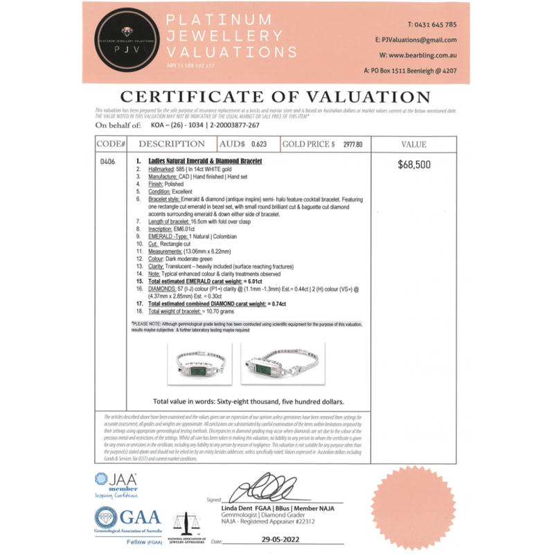 14K WHITE GOLD, 6.01CT COLOMBIAN EMERALD AND DIAMOND, BRACELET. The Design Features, One Rectangle Cut, Dark Moderate Green, Emerald (6.01Ct, Heavily Included, Surface Reaching Fractures, Enhanced), Bezel Set. Decorating The Centre Are, 2 Baguette Cut, Diamonds (0.30Ct Tdw, H Colour, Vs+ Clarity), Bezel Set. Accompanying Are, 57 Round Brilliant Cut, Diamonds (0.44Ct Tdw, I-J Colour, P1+ Clarity), Micro-Claw Set. The Bracelet Has A Fold Over Clasp. Bracelet Length Is 16Cm. 14K White Gold, 6.01Ct Colombian Emerald And Diamond, Bracelet. The Design Features, One Rectangle Cut, Dark Moderate Green, Emerald (6.01Ct, Heavily Included, Surface Reaching Fractures, Enhanced), Bezel Set. Decorating The Centre Are, 2 Baguette Cut, Diamonds (0.30Ct Tdw, H Colour, Vs+ Clarity), Bezel Set. Accompanying Are, 57 Round Brilliant Cut, Diamonds (0.44Ct Tdw, I-J Colour, P1+ Clarity), Micro-Claw Set. The Bracelet Has A Fold Over Clasp. Bracelet Length Is 16Cm. Jewellery Valuations Provided By A Third Party Professional Not Directly Associated With Lloyds Auctions at AUD $68,500.00This Insurance Valuation has been provided by a registered Jewellery Valuer and is intended for insurance purposes only. The valuation amount has no bearing on the auction value of the item. Any questions regarding the valuation should be directed to the issuing Valuer (refer to contact details on the certificate) as Lloyds have no association or relationship with the Valuer or the valuation amount contained within the valuation. Condition: NEW 0645883+5086