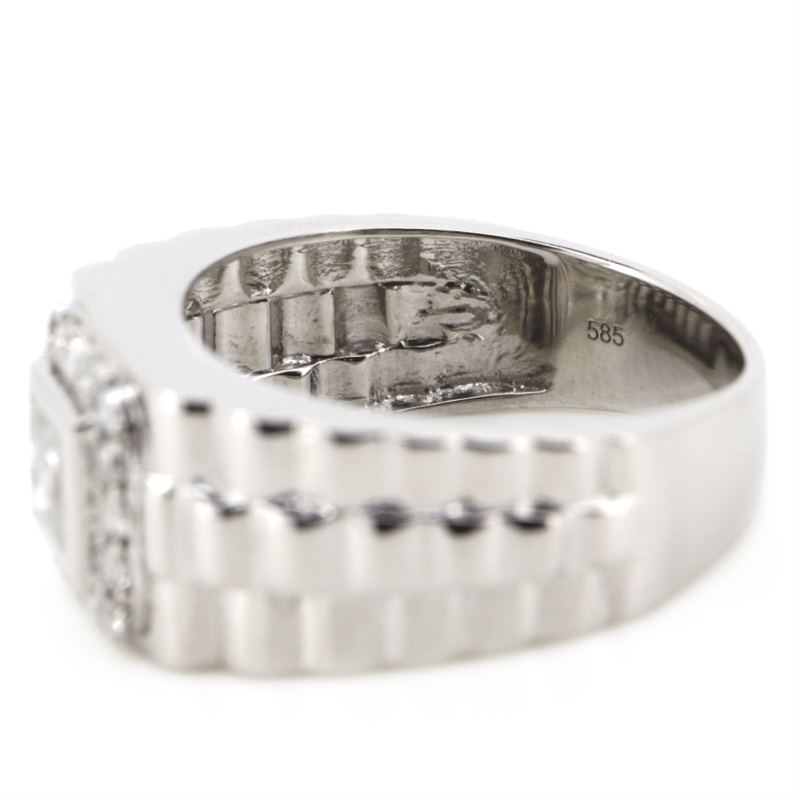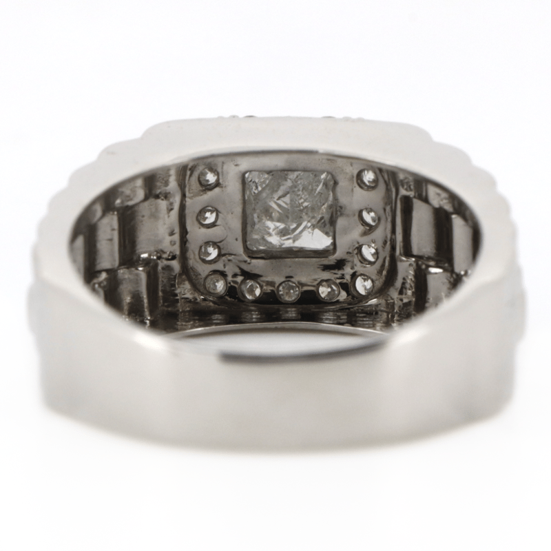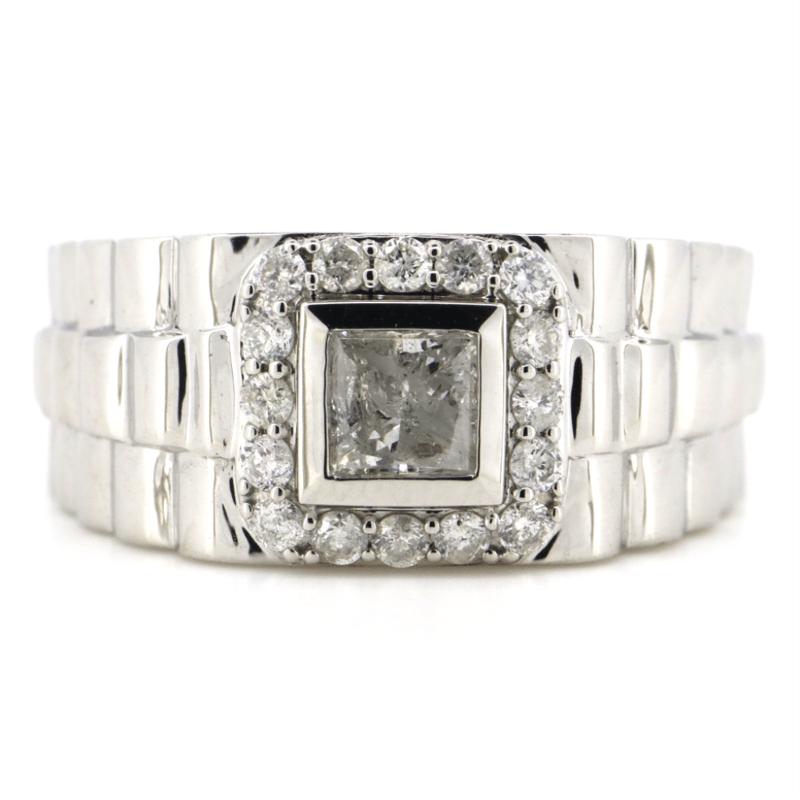 14K White Gold And Diamond, Statement Gents Ring. The Centre Features, One Princess Cut, Diamond (0.80Ct, I-J Colour, P1-P2 Clarity), Bezel Set. Surrounding The Centre In A Halo Are, 16 Round Brilliant Cut, Diamonds (0.38Ct Tdw, I-K Colour, Si2-P2 Clarity), Shared Bead Set. Ring Size T.