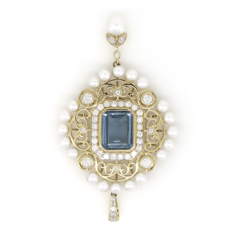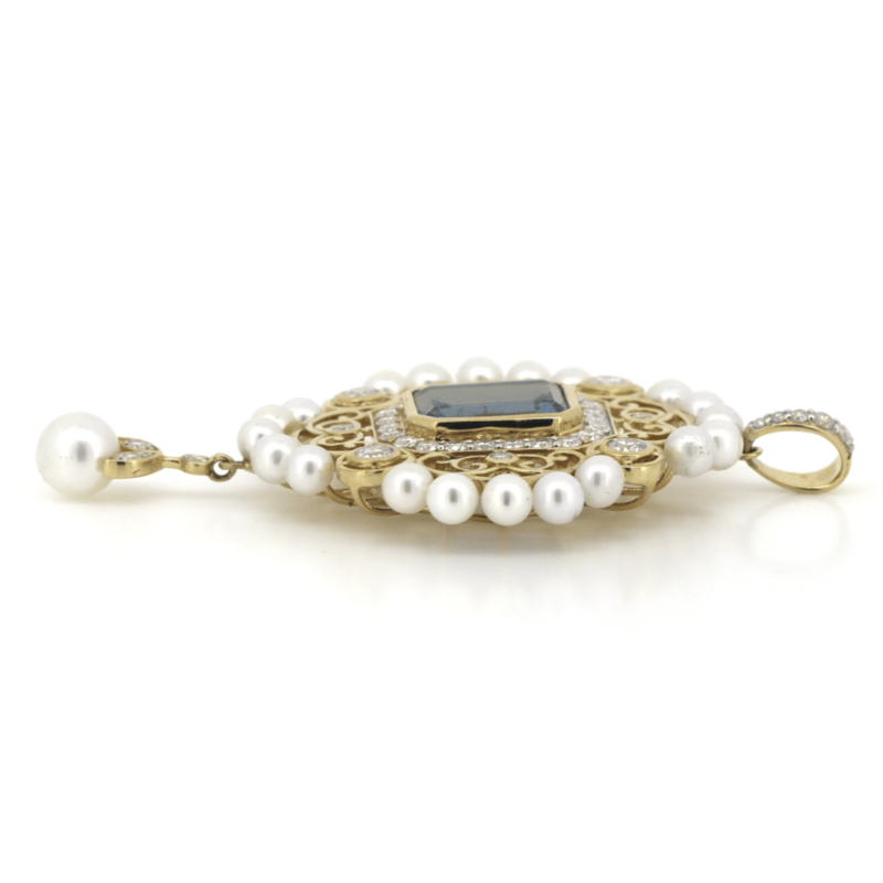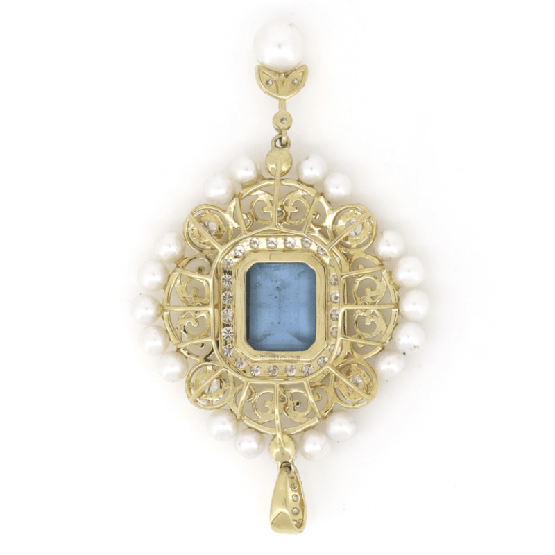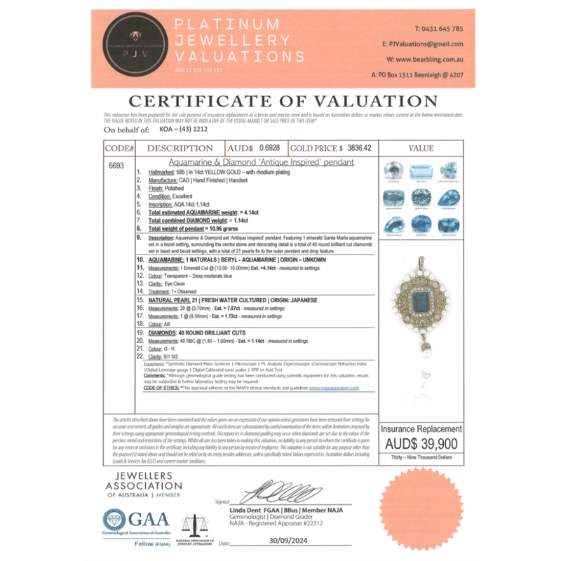 14K YELLOW GOLD, AQUAMARINE, DIAMOND AND WHITE JAPANESE FRESH WATER PEARL, ORNATE PENDANT. The Centre Features, One Emerald Cut, Deep Moderate Blue, Aquamarine (4.14Ct, Eye Clean Clarity, Enhanced), Bezel Set. Surrounding The Centre In A Halo And Embellishing The Design Are, 40 Round Brilliant Cut, Diamonds (1.14Ct Tdw, G-H Colour, Si1-Si2 Clarity), Bead/Bezel Set In White Gold. Decorating The Design Are, 21 White, Japanese Fresh Water Pearls (3.70Mm/6.50Mm Sizes, Ab Colour). 14K Yellow Gold, Aquamarine, Diamond And White Japanese Fresh Water Pearl, Ornate Pendant. The Centre Features, One Emerald Cut, Deep Moderate Blue, Aquamarine (4.14Ct, Eye Clean Clarity, Enhanced), Bezel Set. Surrounding The Centre In A Halo And Embellishing The Design Are, 40 Round Brilliant Cut, Diamonds (1.14Ct Tdw, G-H Colour, Si1-Si2 Clarity), Bead/Bezel Set In White Gold. Decorating The Design Are, 21 White, Japanese Fresh Water Pearls (3.70Mm/6.50Mm Sizes, Ab Colour). Jewellery Valuations Provided By A Third Party Professional Not Directly Associated With Lloyds Auctions at AUD $39,900.00This Insurance Valuation has been provided by a registered Jewellery Valuer and is intended for insurance purposes only. The valuation amount has no bearing on the auction value of the item. Any questions regarding the valuation should be directed to the issuing Valuer (refer to contact details on the certificate) as Lloyds have no association or relationship with the Valuer or the valuation amount contained within the valuation. Condition: NEW 0645883+5018