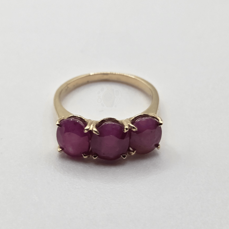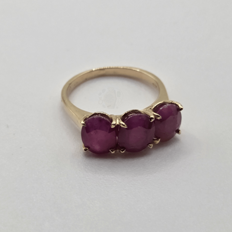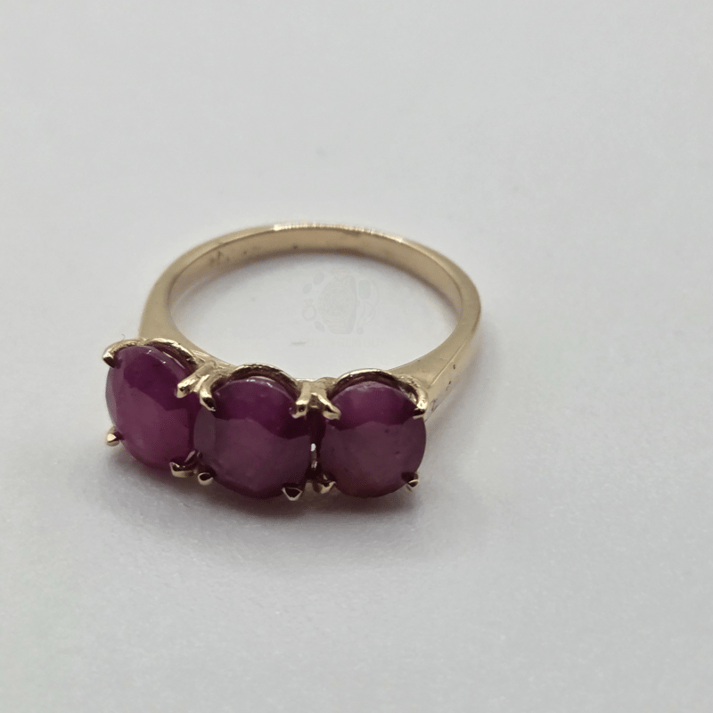 Certified 9Ct Yellow Gold Dress Ring Featuring Three Oval-Shaped Natural Rubies In Claw Settings. The Stones Display A Purplish-Red Hue With Moderate Inclusions And No Heat Treatment. Mounted On A Polished 2.19 Mm Half-Round Band With Upswept Shoulders. Valued By Crown Jewellery (Sydney) At A$14,395.