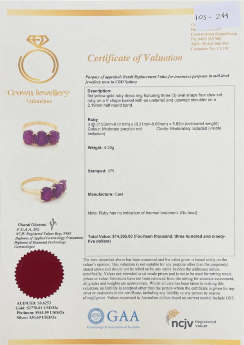 • Certification: Crown Jewellery Valuation – Ghazal Ghasemi F.G.A.A., Dg (Ncjv N 683)