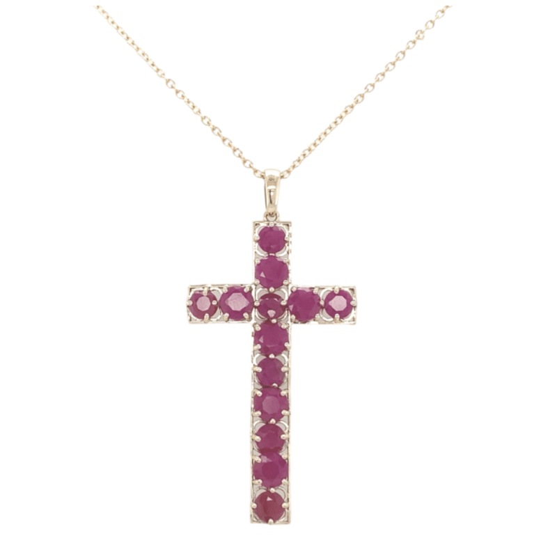 Certified 9Ct Yellow Gold Cross Pendant Featuring Thirteen Round-Shaped Natural Rubies Set In Four-Claw Mounts And Arranged In A Cross Formation. The Rubies Display Medium To Deep Red Hues With Moderate Inclusions. Valued By Crown Jewellery (Sydney) At A$10,850.